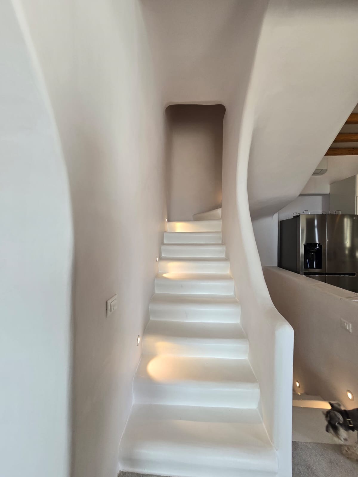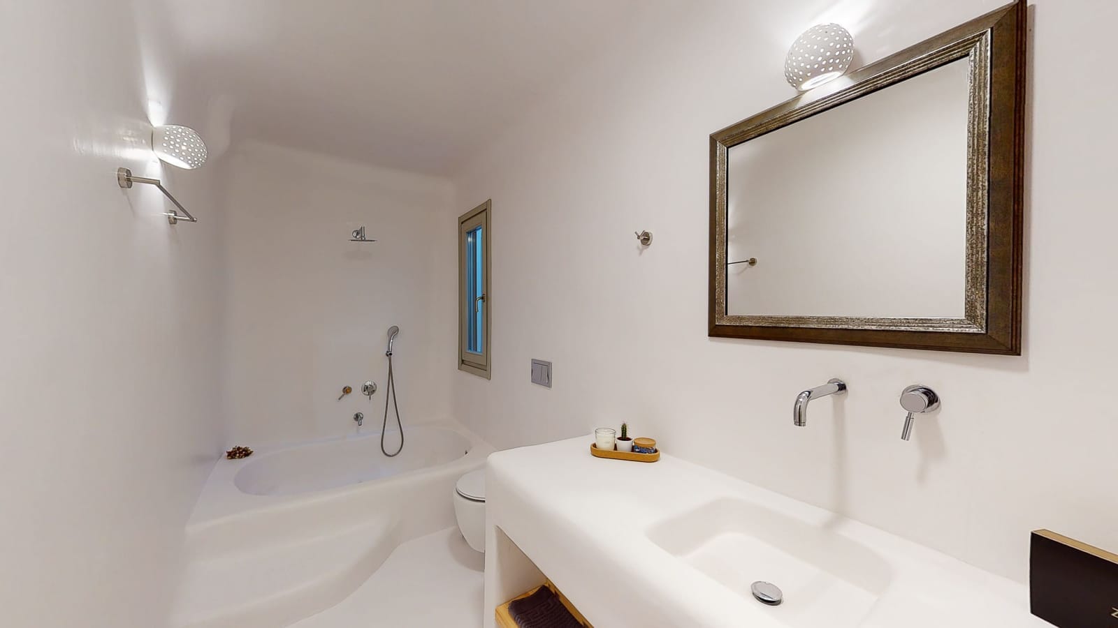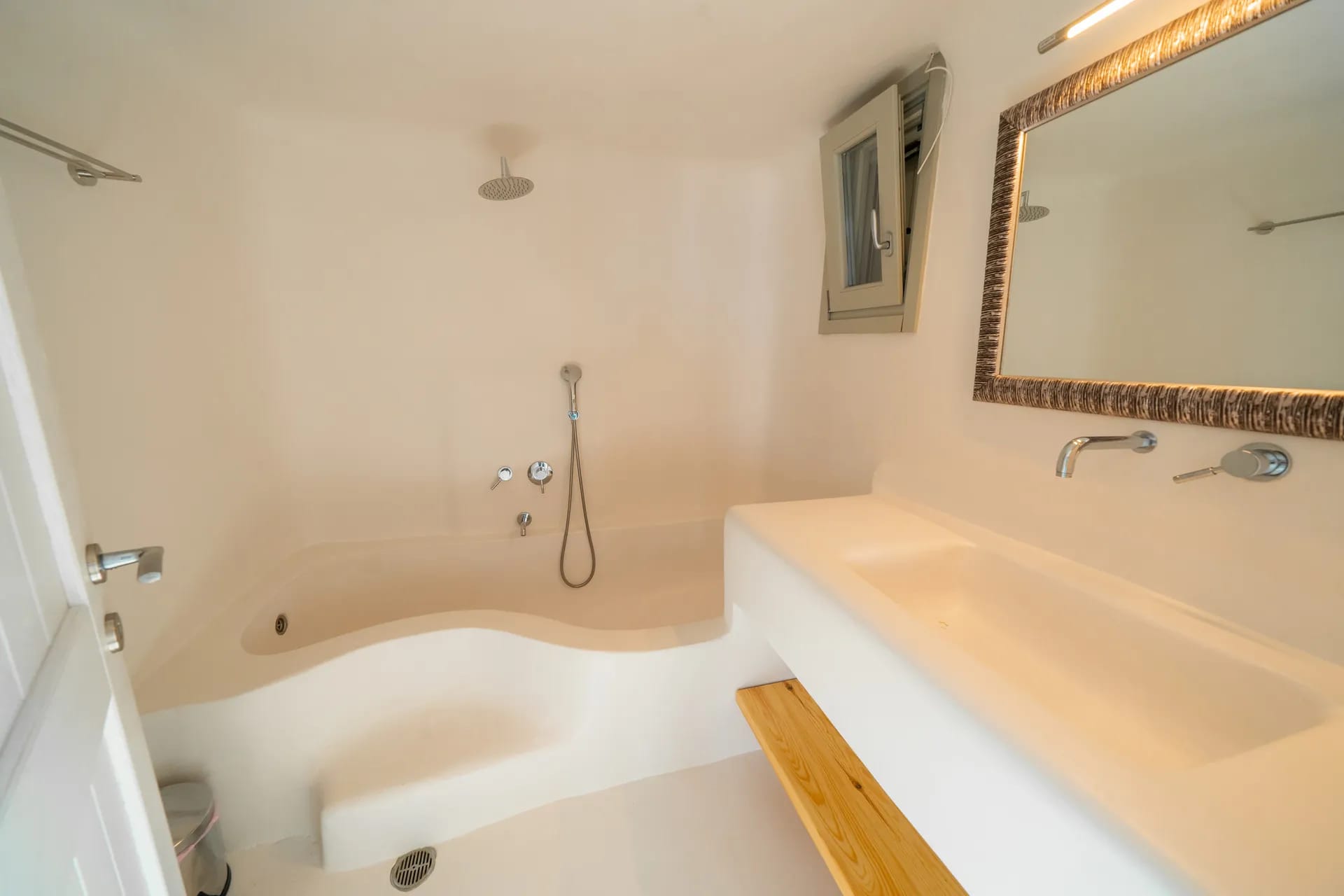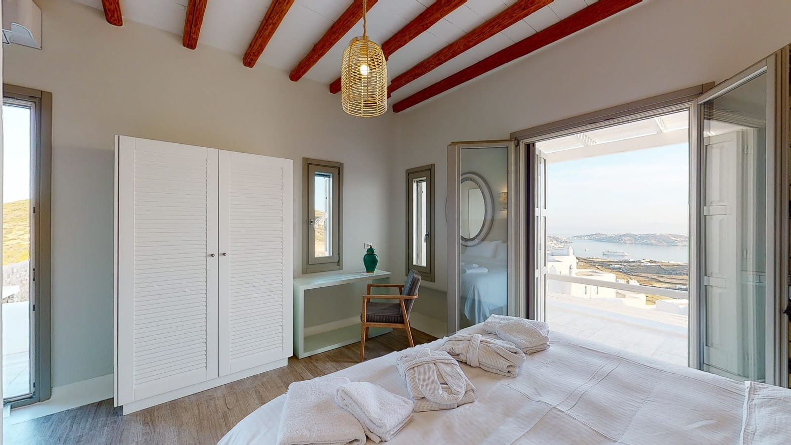 The property combines minimal Cycladic architecture with contemporary luxury, whitewashed lines, natural stone elements, and high-end furnishings, creating an elegant and serene atmosphere throughout.