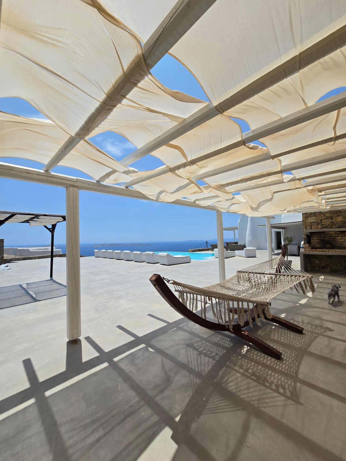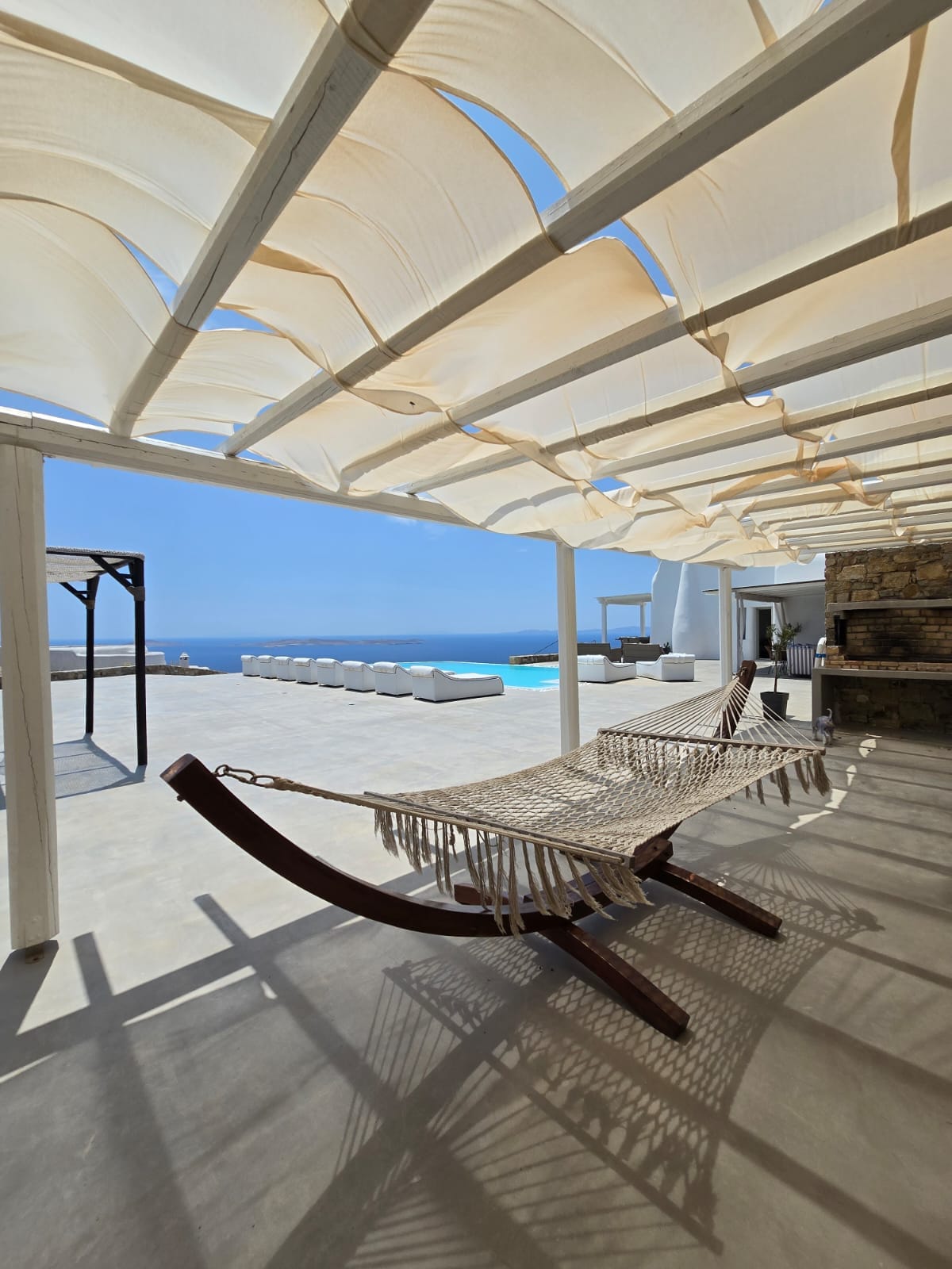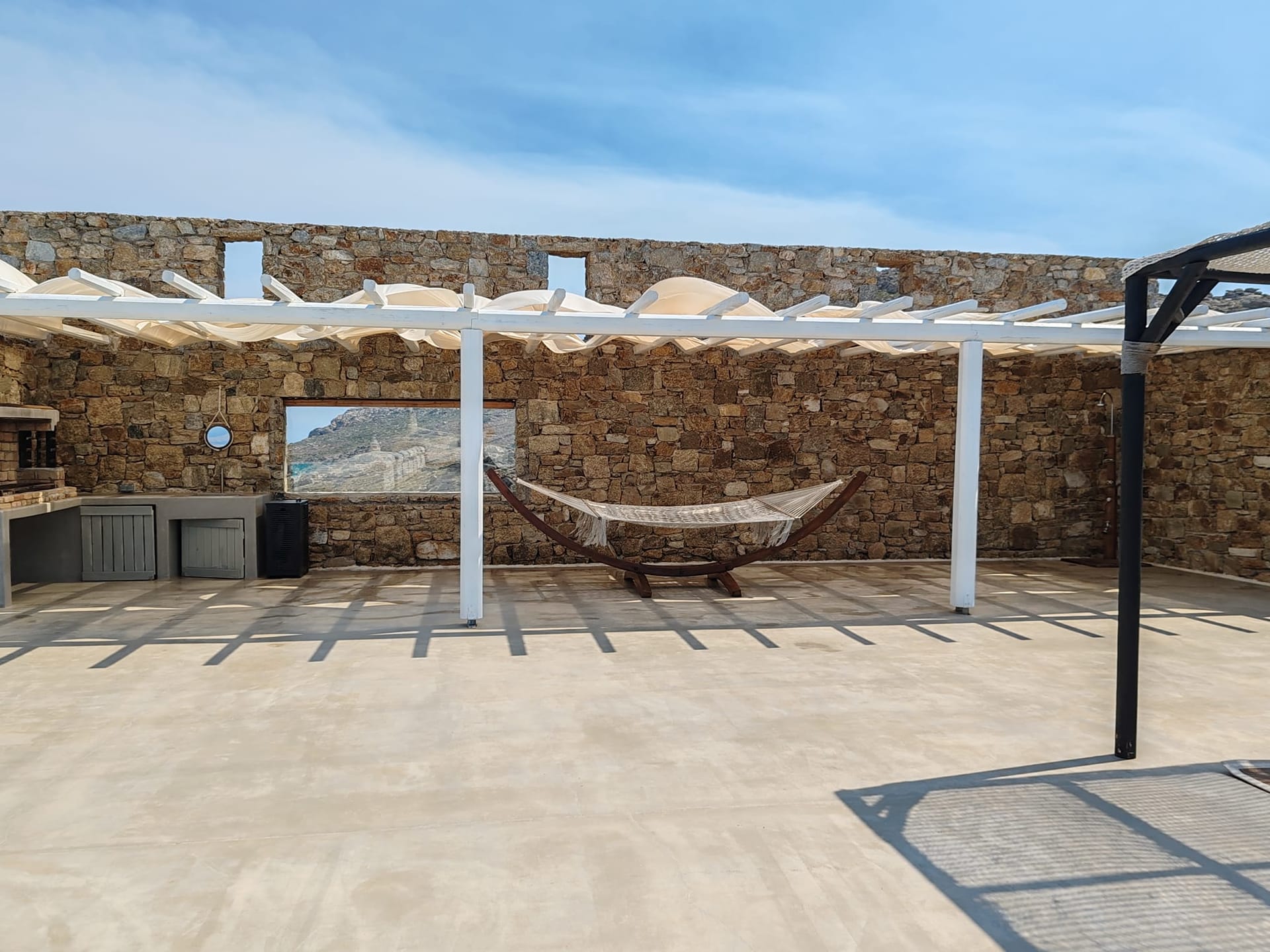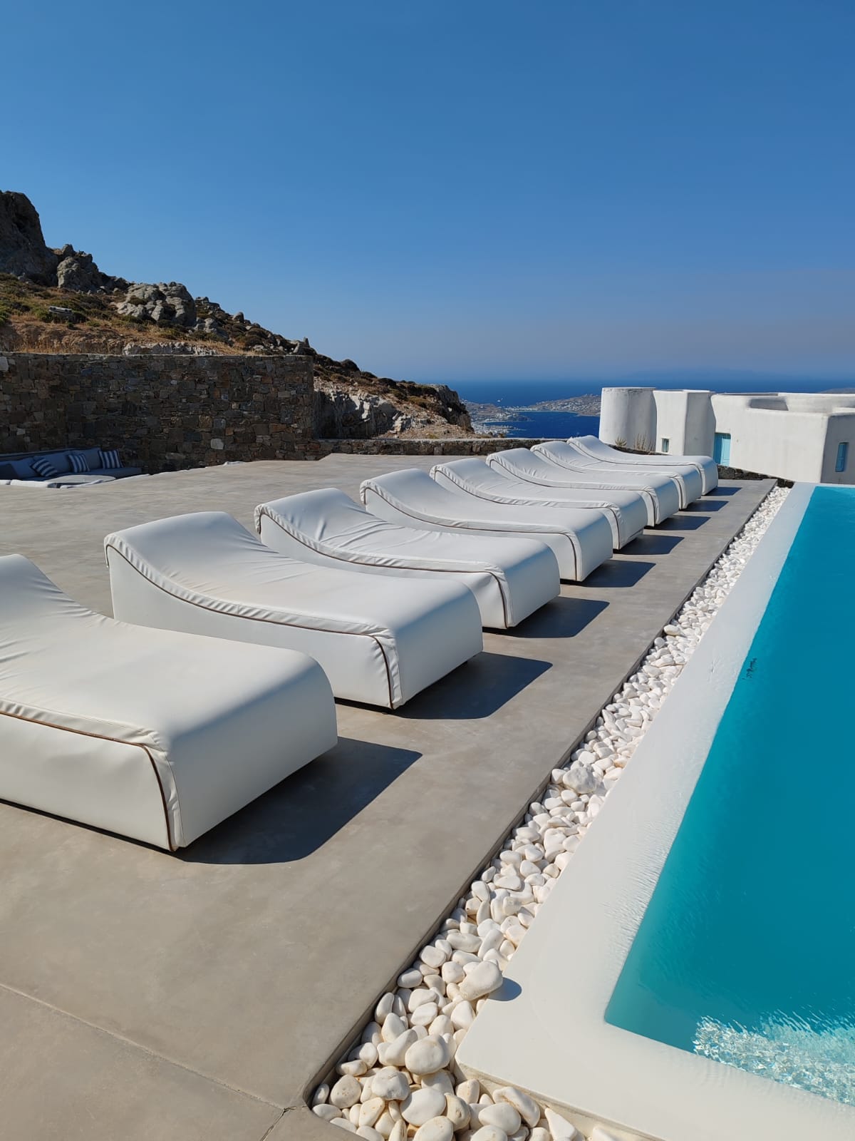 The outdoor spaces of Villa Atlas are designed for both relaxation and entertainment, offering an impressive setting overlooking the Aegean Sea: