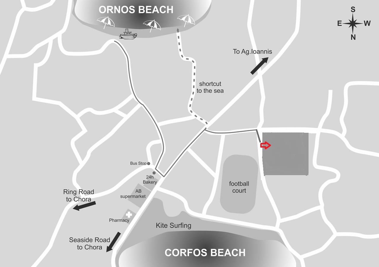 You will pass two smaller streets on your right. At the third street turn right, where there is a Corfos Hotel and Yannaki Hotel sign at the corner. At the end of the football field turn right and you will see the entrance to the Complex.