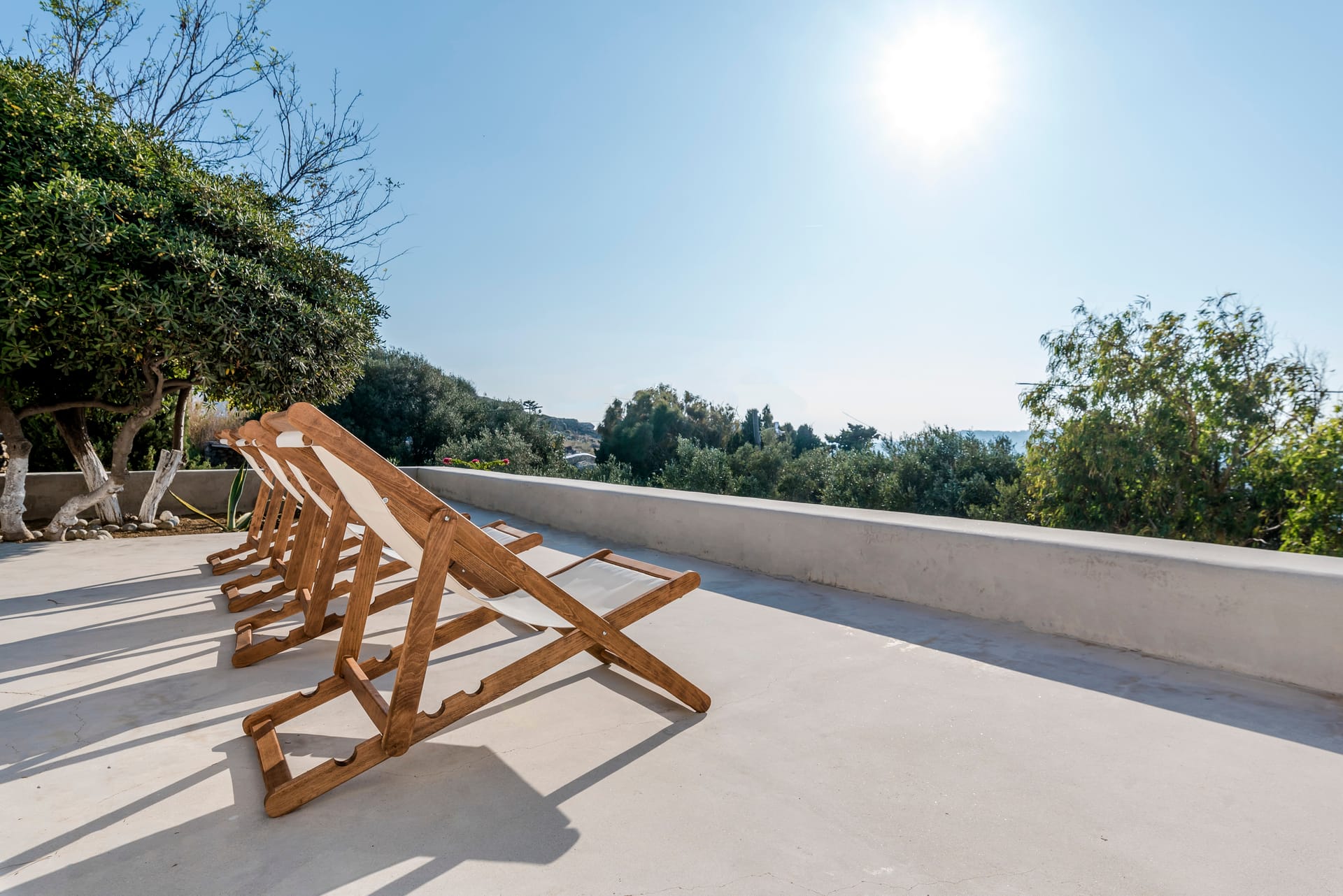 The pool area is situated on a separate level in the front, surrounded by trees and offering a splendid sea view. Sunbathe around the pool and unwind or escape from the midday heat in the shady outdoor sitting areas under the pergolas. From the villa you may enjoys sunset and town view.