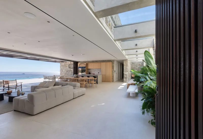 The exceptional architectural design of the property includes 2 indoor living rooms and 4 outdoor lounge areas spread around and oriented differently along the impressive patio. Natural materials, such as stone and wood, dominating both interior and exterior, minimal design, and soft tones create a sense of tranquillity and balance, gently absorbing and diffusing light throughout the day. The luxurious, subtly decorated interior generates a light atmosphere, and blends harmoniously with its natural environment, creating comfortable, autonomous spaces in a prominent location.