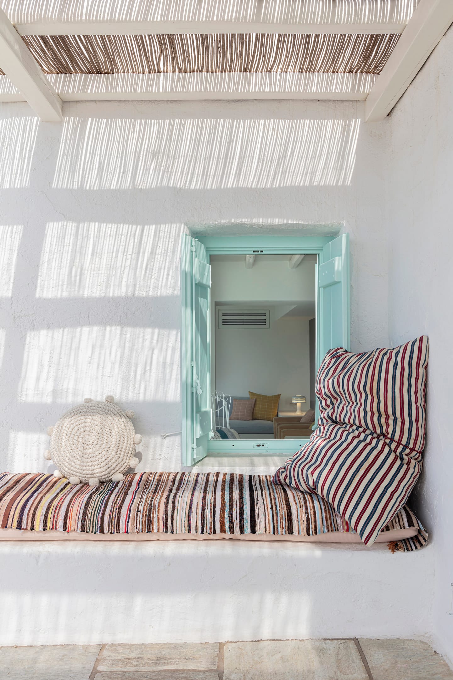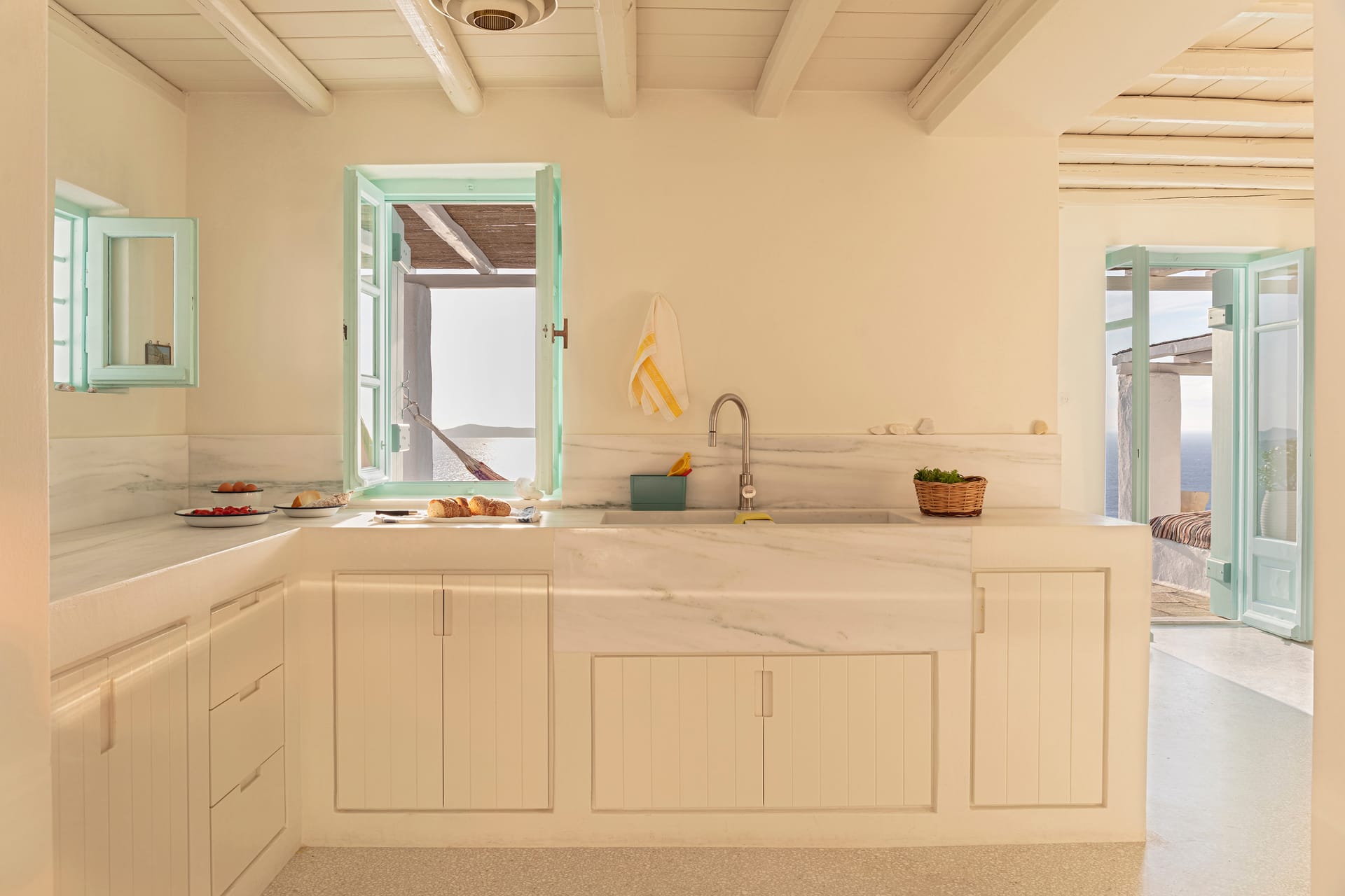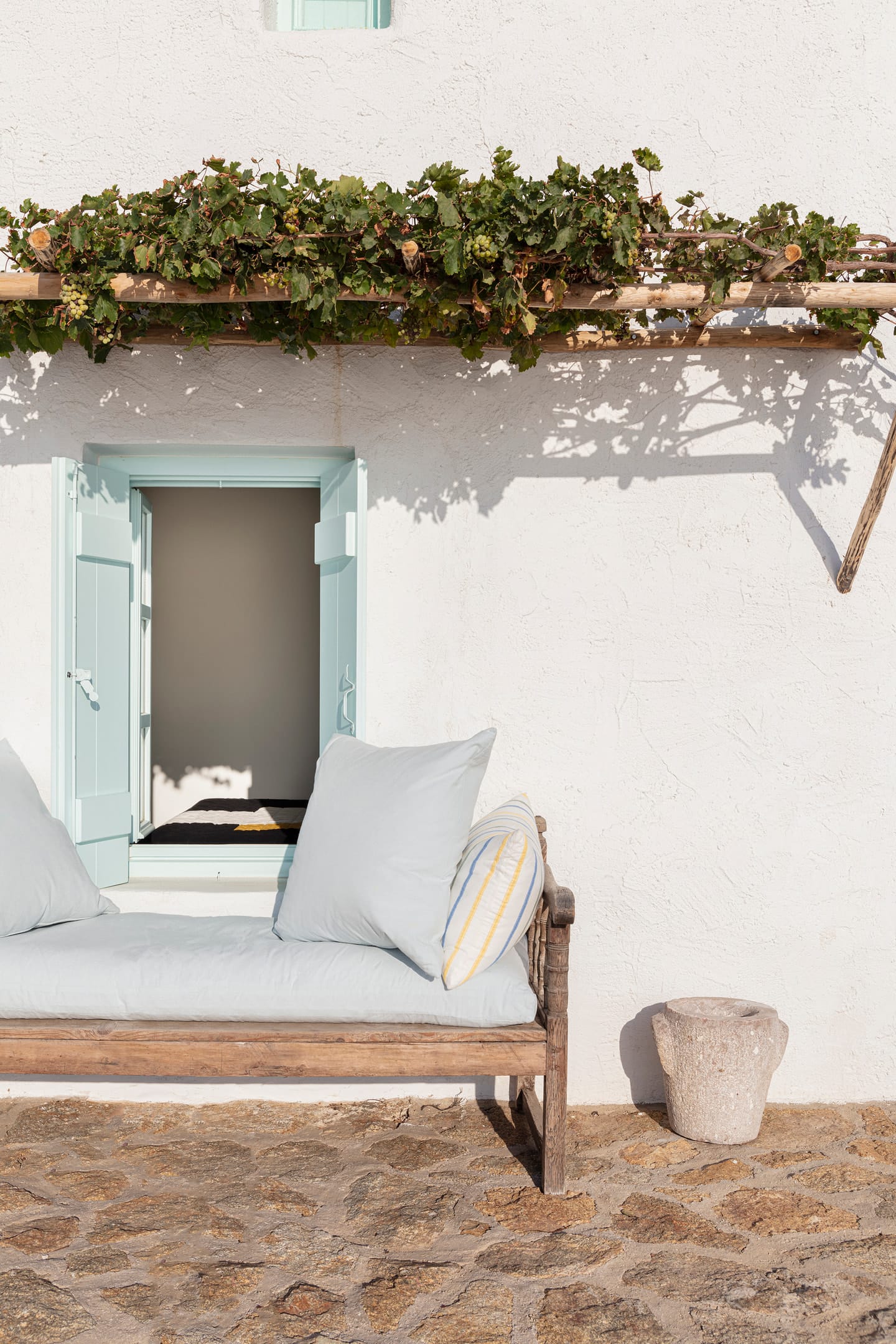 The villa’s cool interiors feature pristine terrazzo floors throughout, rustic wood-carved doors, traditional ceramic tiles and superior local marble for the bathrooms and kitchen. Outside, a variety of terraces, balconies and niches distributed around the property allow for increased privacy even among a large group of guests.