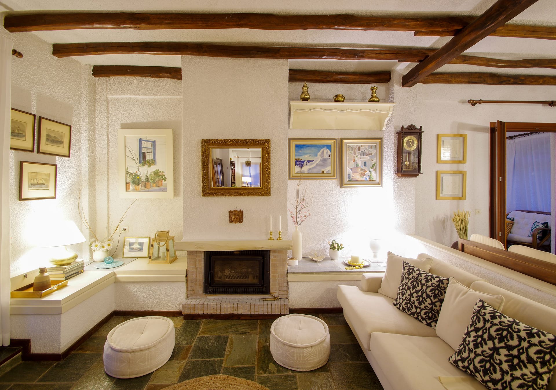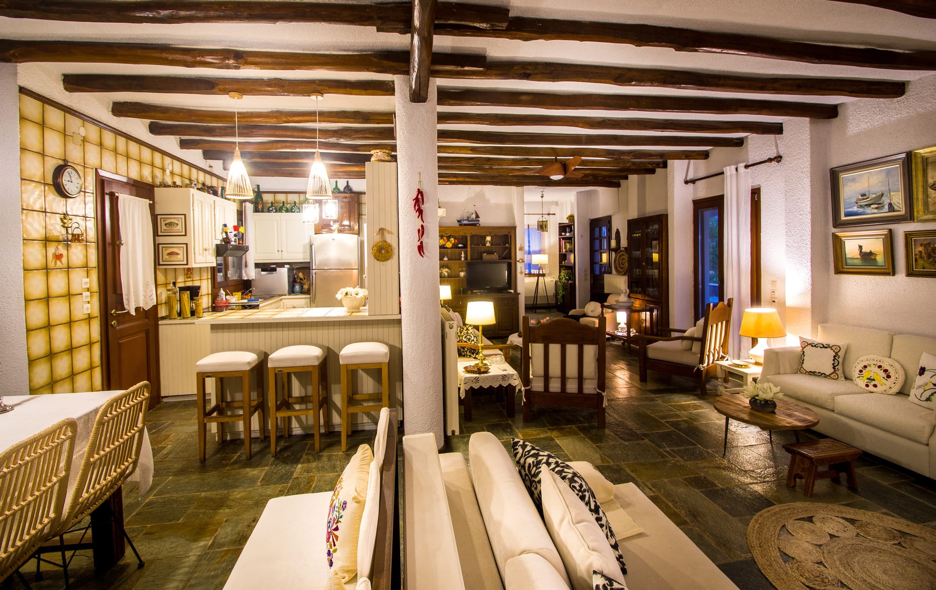 Inside, there are five bedrooms, a loft and five bathrooms finished in crisp white with tasteful ethnic accents that complement Mykonian style. The villa comes with daily maid service and modern conveniences for a relaxed stay.