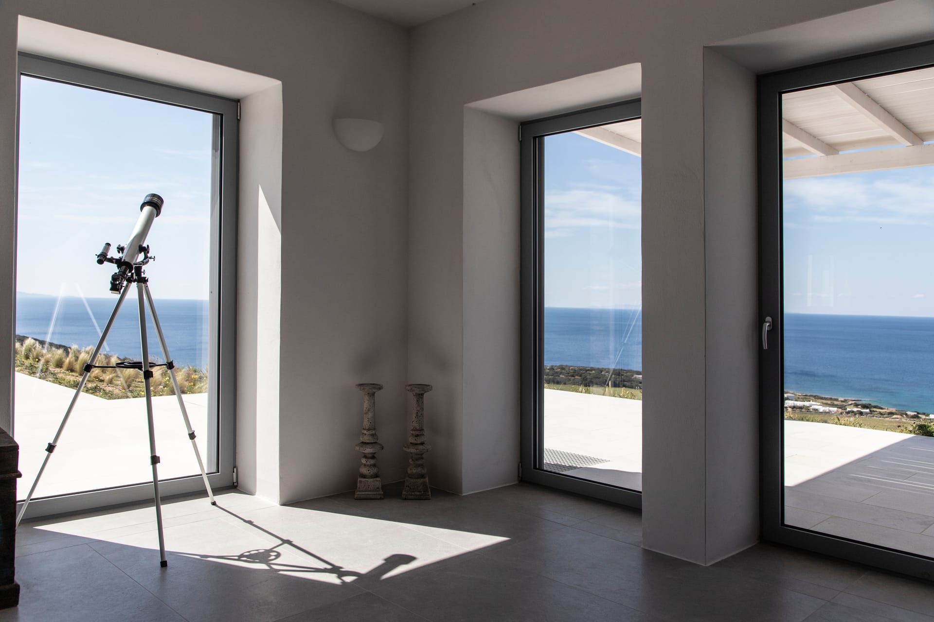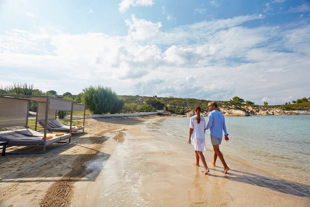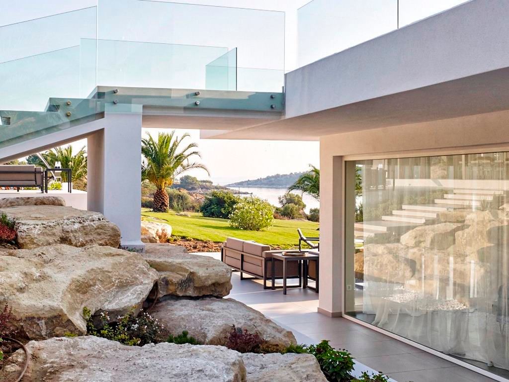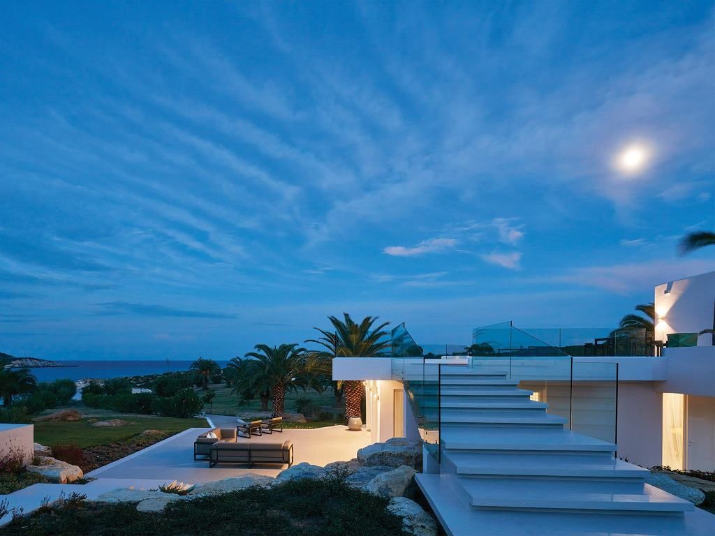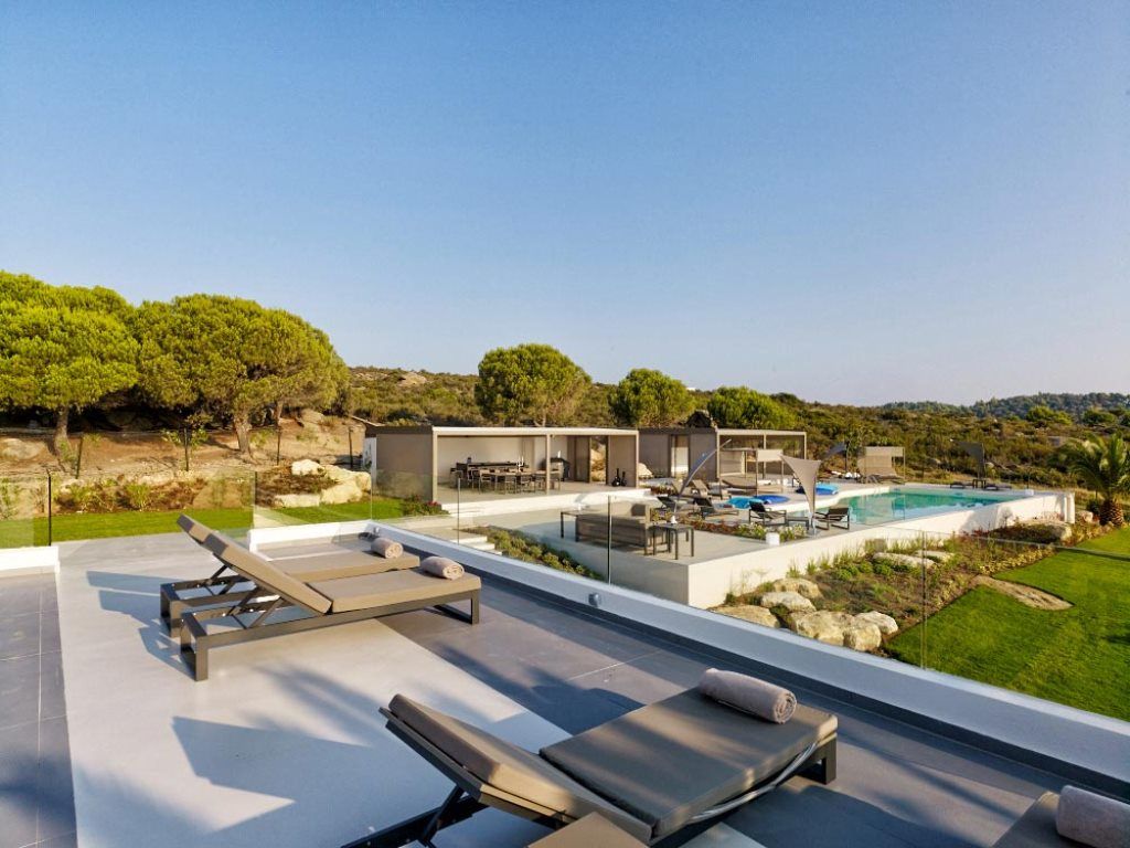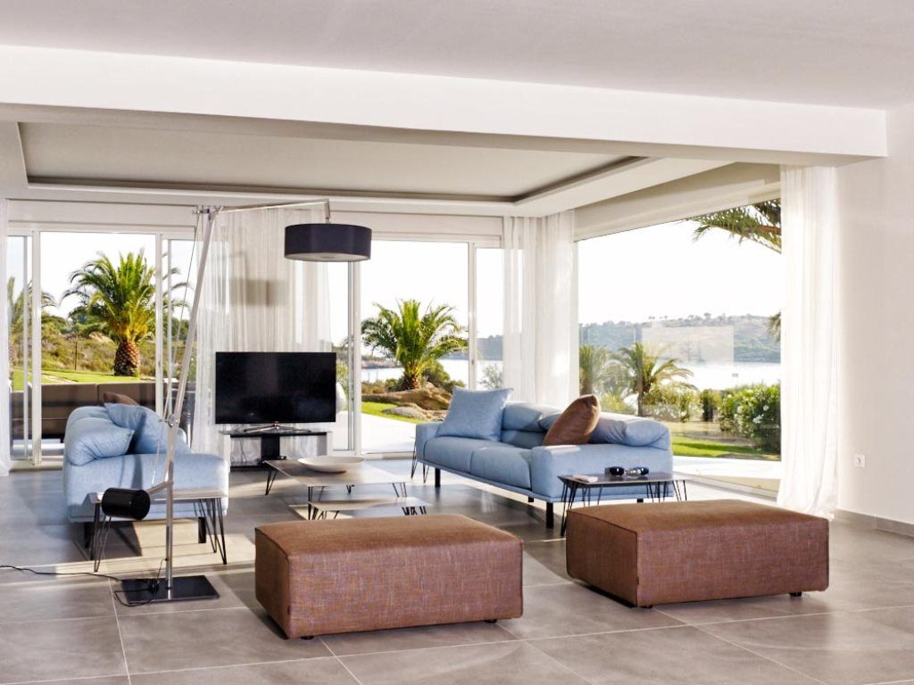 The 260 m² first floor features 4 bedrooms (2 with shared bathroom), two master bedrooms with an office area and sofa beds, en-suite bathroom with shower -whirlpool bath along with majestic views to the private beach and Mount Athos.