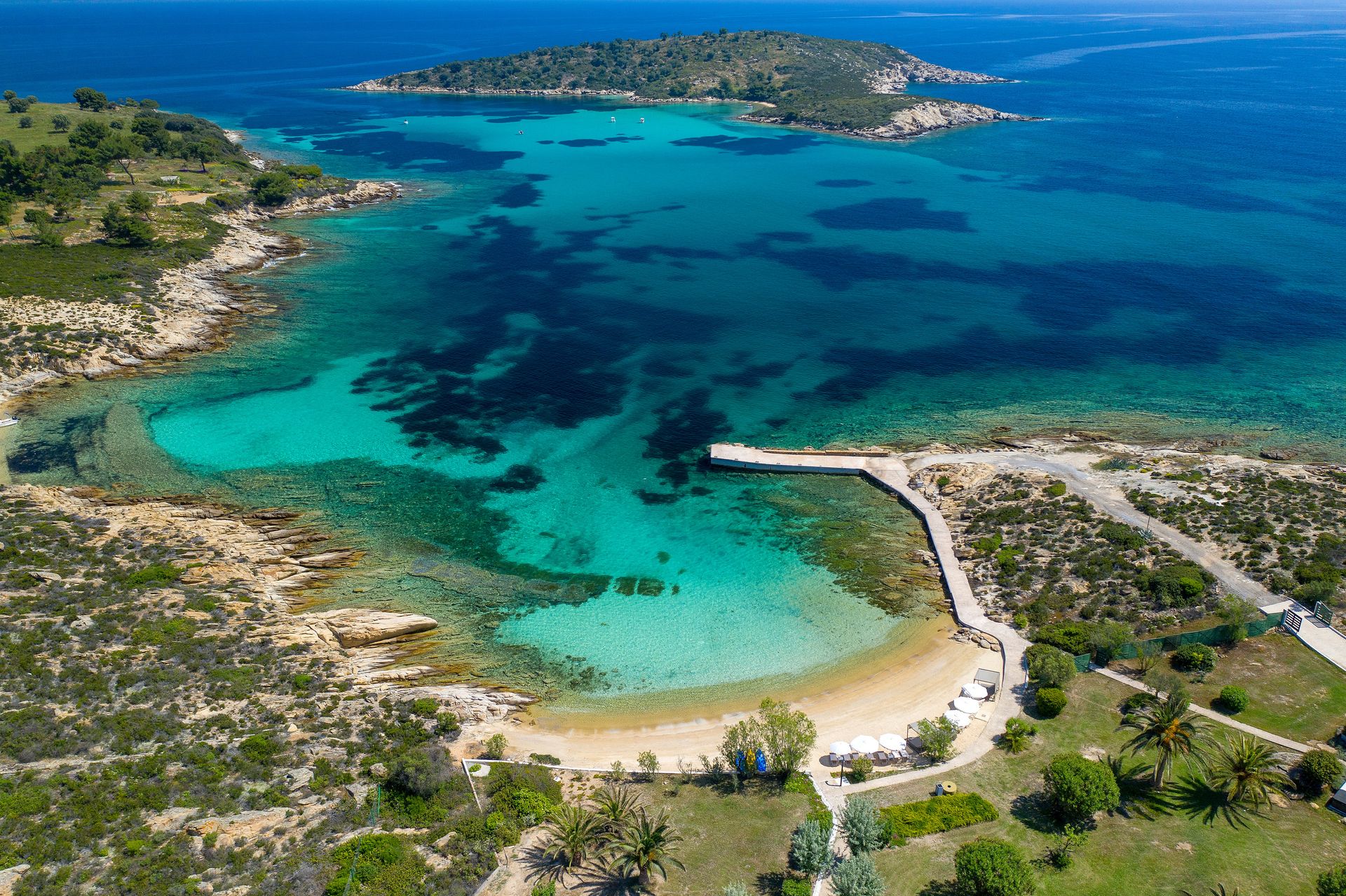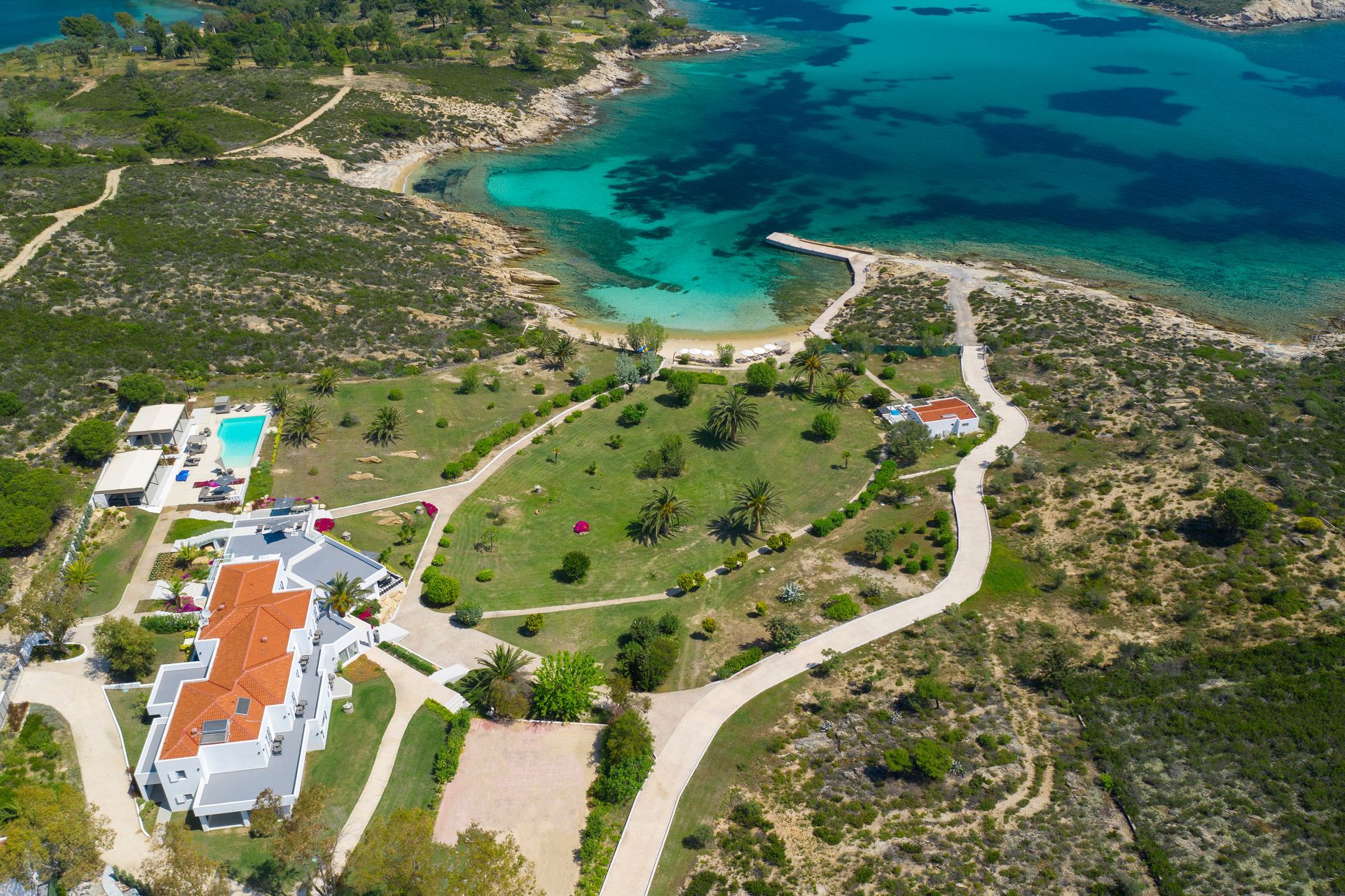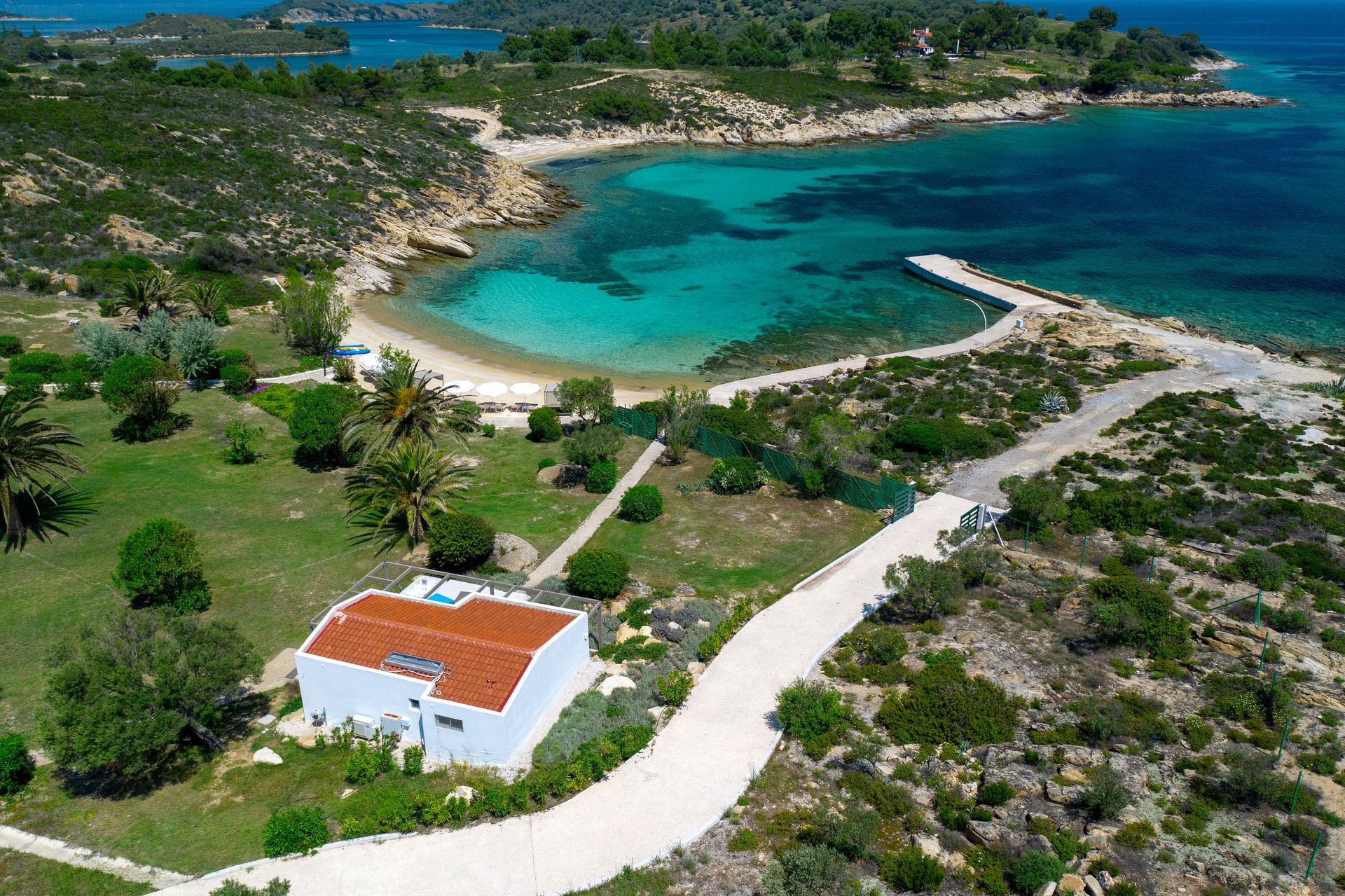 This unique property lies on the northeast side of the island between two private natural coves with calm warm water and a private jetty for easy access, where big large sailing boats can anchor.