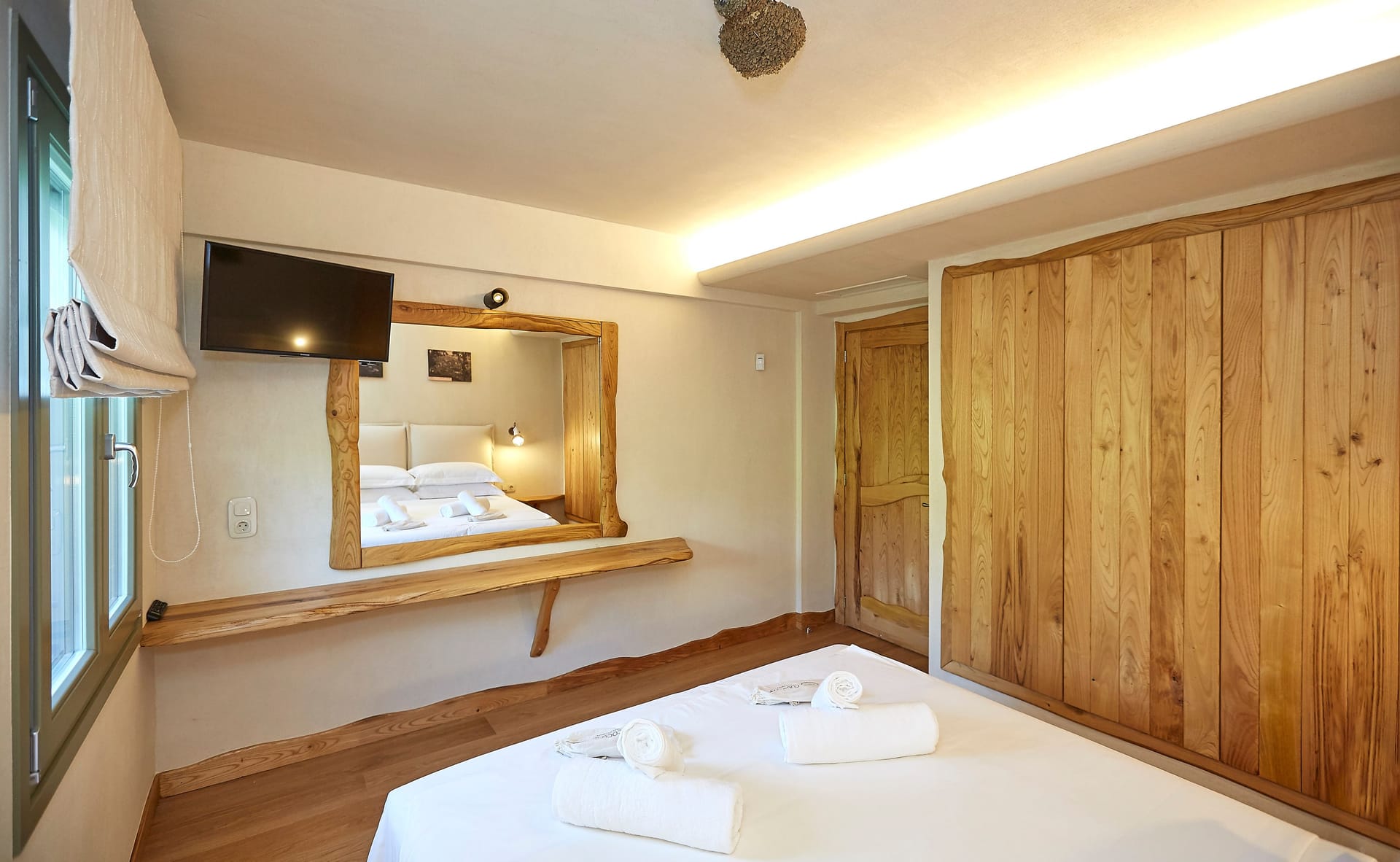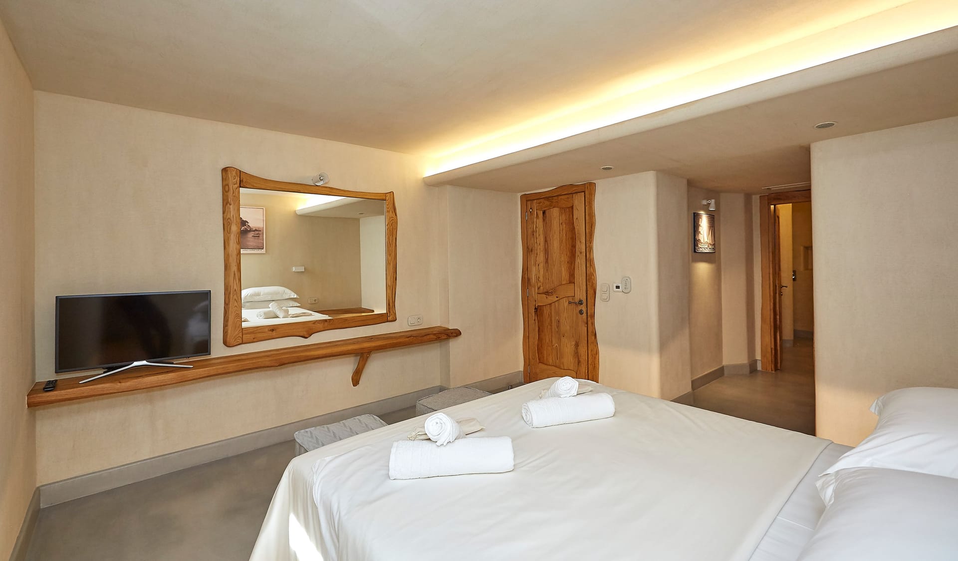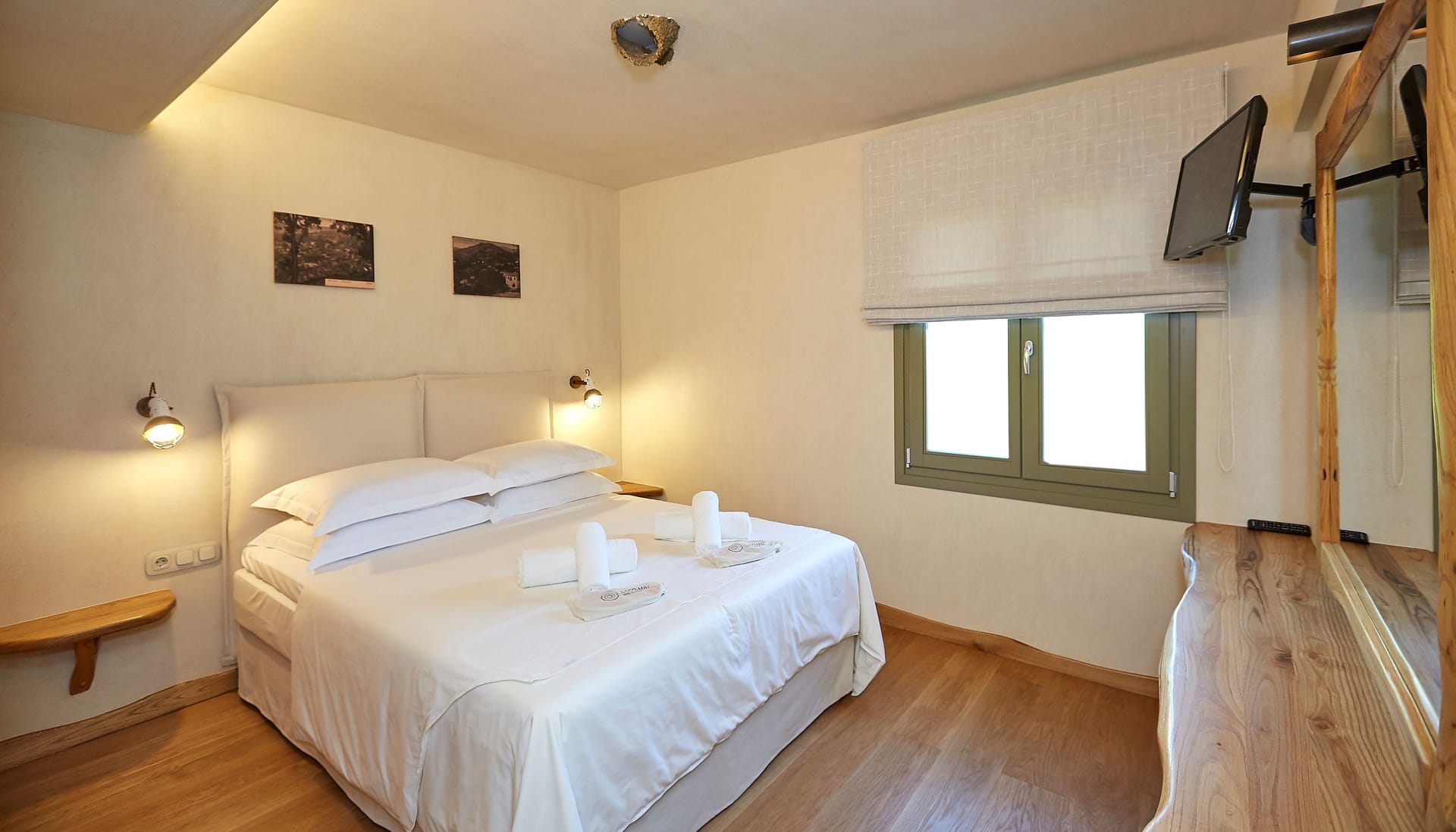 Both bedrooms are composed of a double bed measuring 160x200cm for ccomfortable sleeping, boudoir with a mirror for your self-care routine that can be used as an office, an open closet with storage compartments, Smart TV 32 inches, private bathroom with a waterfall shower, designer self-care products and a private terrace with a table and chairs and a garden view.