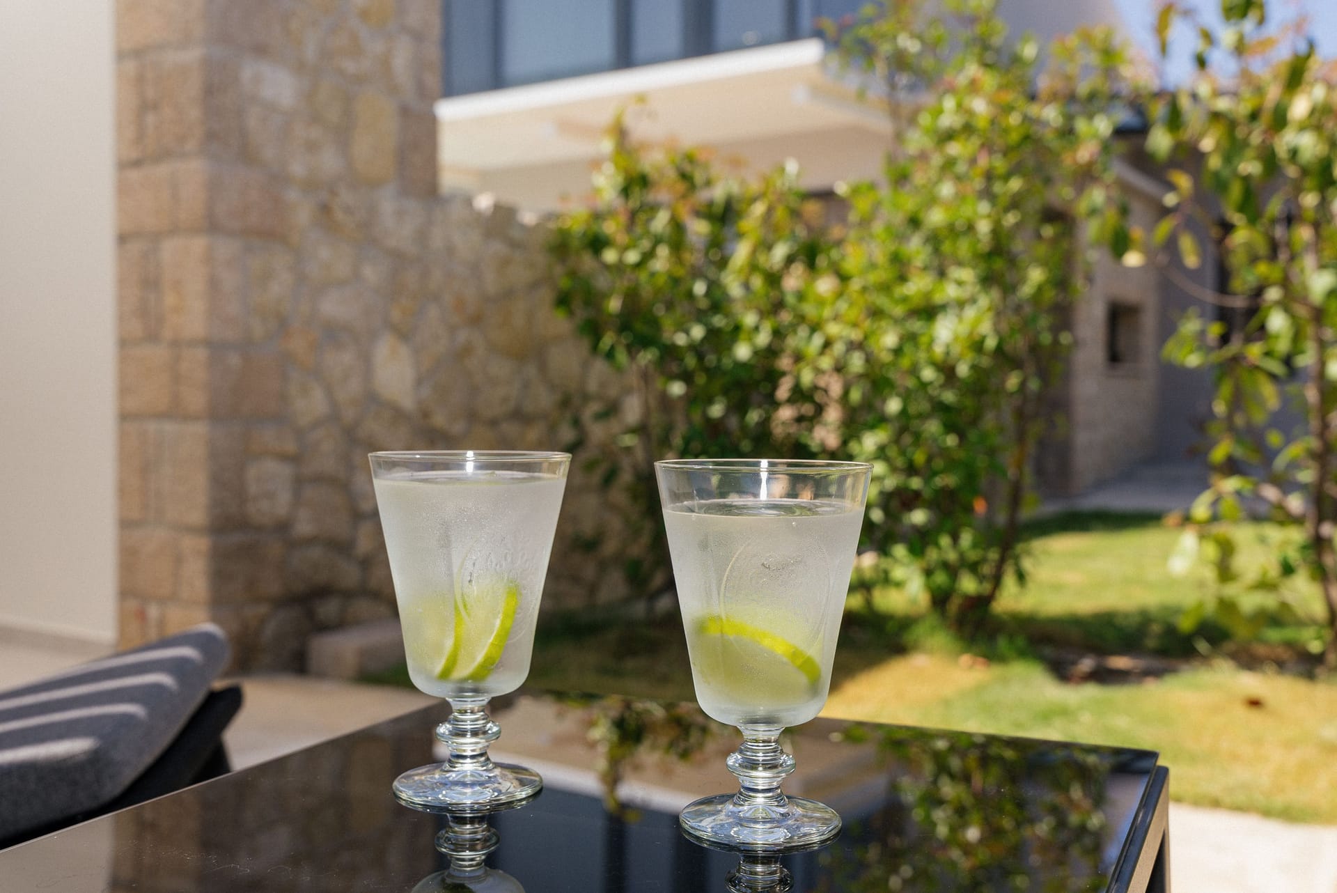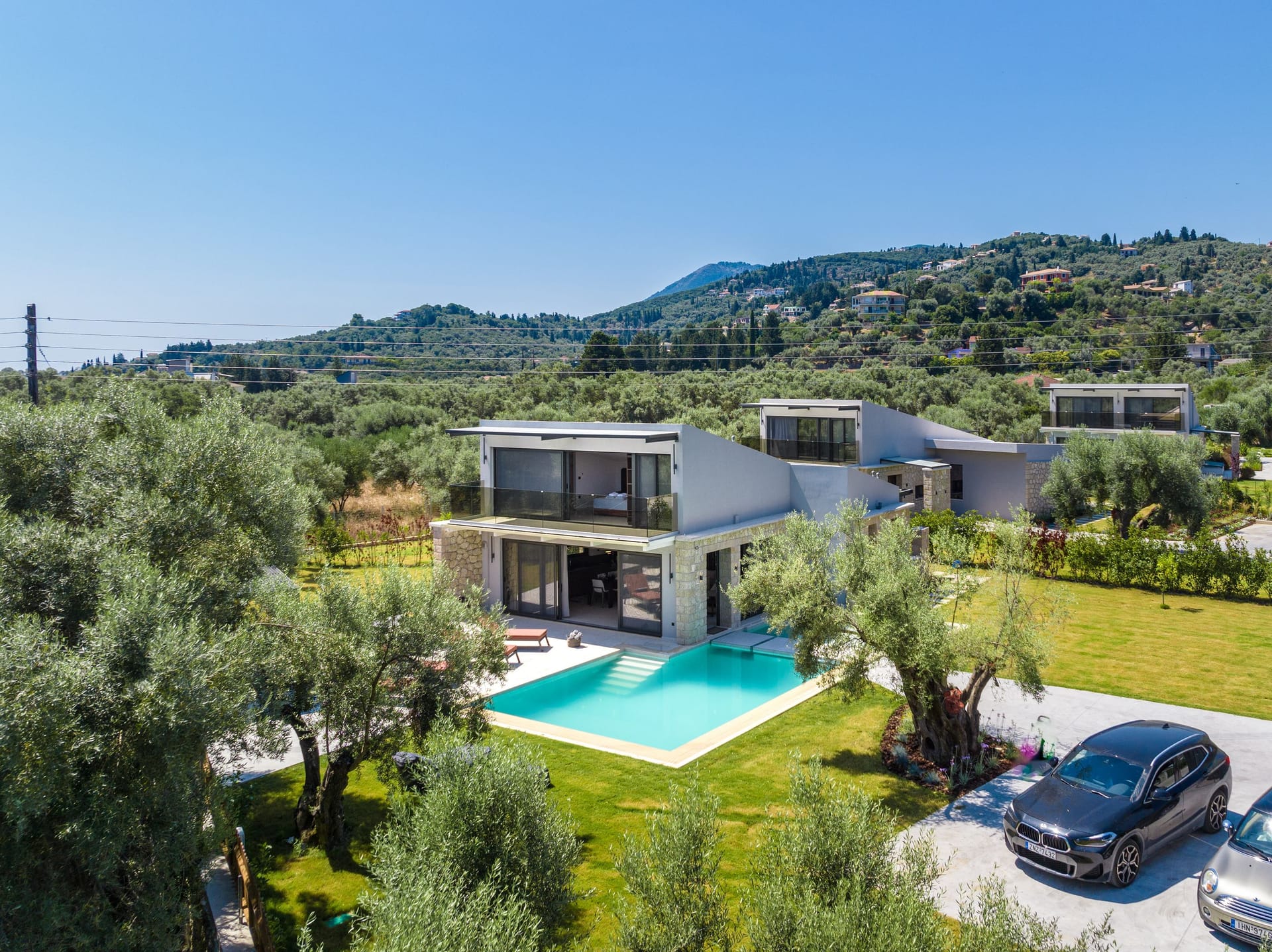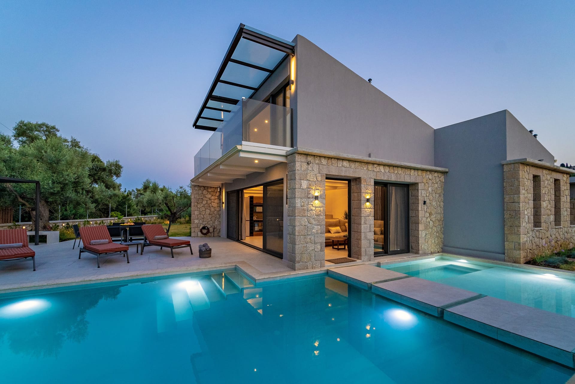 The outdoor space is considered an extension of the second level. The spacious infinity pool is only a few steps away from the lounge area, as well as the enjoyable jacuzzi. After the games with the cool water, relax on the comfortable loungers, at the dining table, on the grass, or under the ancient olive trees.
