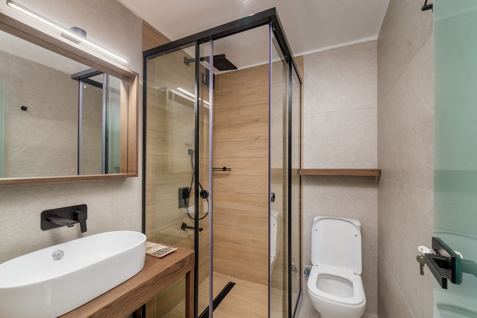 The bedroom is composed of a double bed 160x200cm for comfort sleep, boudoir with a mirror that can be used as an office, an open closet with storage compartments, Smart TV 32 inches, private bathroom with a waterfall shower, designer self-care products and a private terrace with a table and chairs and a garden view.