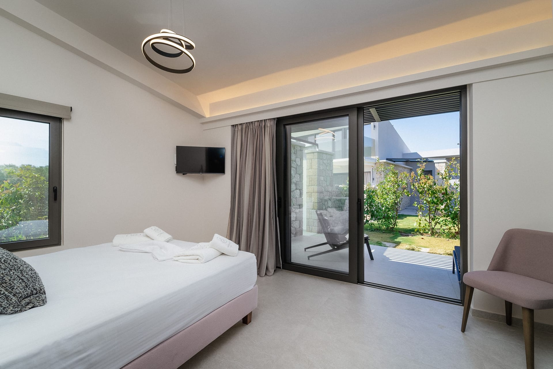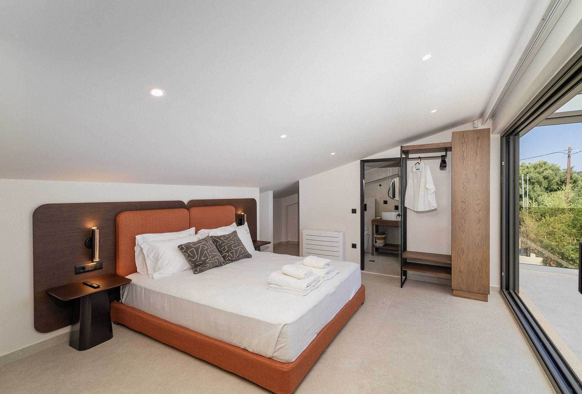 Both from within the room and from its terrace, you can enjoy the incredible view of the settlement of Lygia, the pool, and the villa’s garden.