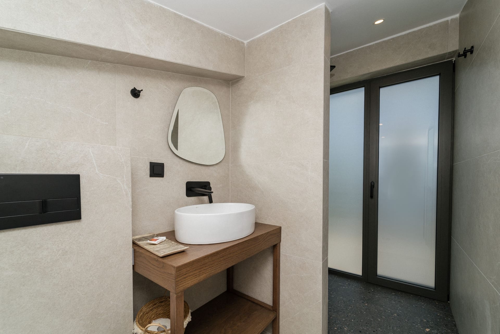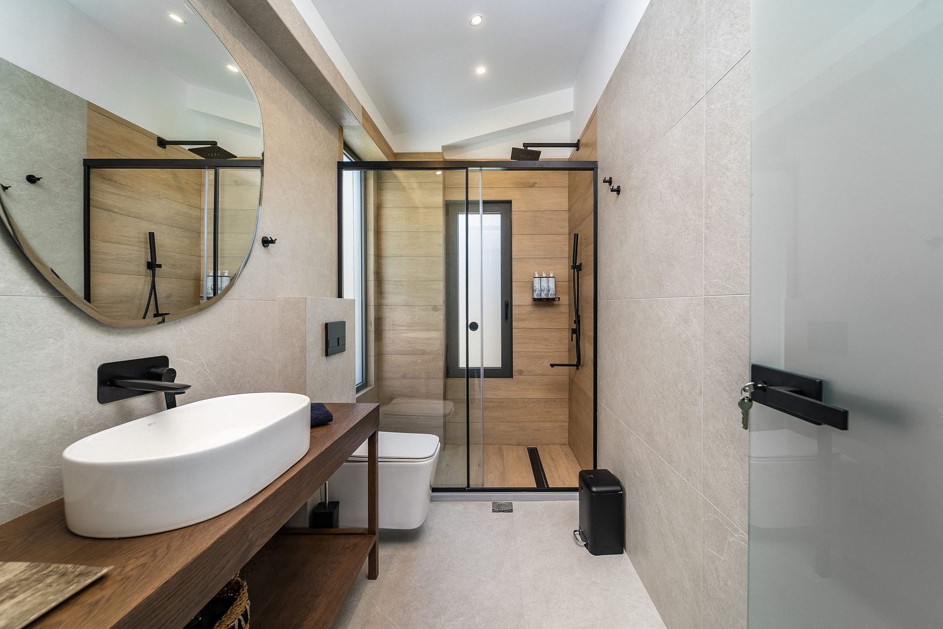 The first level hosts a bedroom with an en-suite bathroom, an entertainment area, and a sauna room. It is ideal for your teenagers, as they won’t get bored, for members of your personal security and care, and for those who seek isolation for a few hours from the rest of the household. Due to its underground construction, it is considered as the coolest level of the villa. It’s connected with the other two levels via an outdoor staircase.
