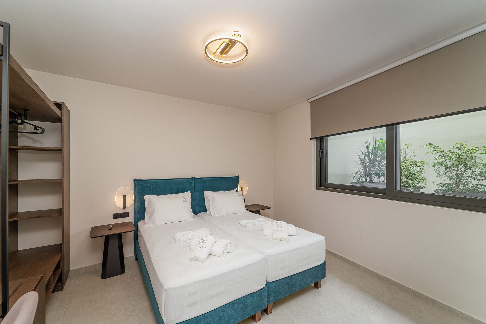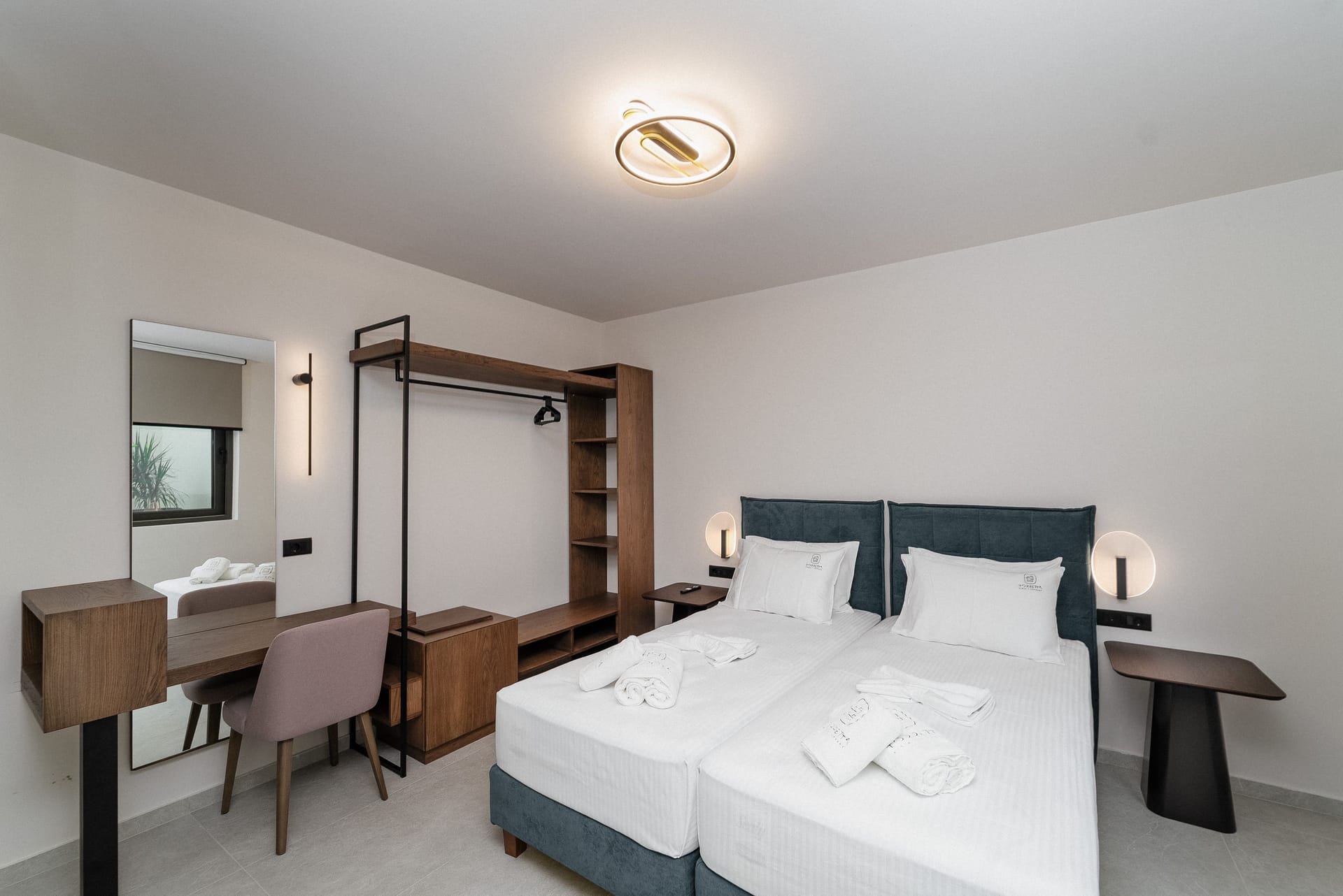 The bedroom area is composed of 2 single beds that can be converted into double beds, a boudoir with a mirror that can be used as an office, an open closet with storage compartments, a smart TV 32-inches and an en-suite bathroom with a waterfall shower and designer self-care products.