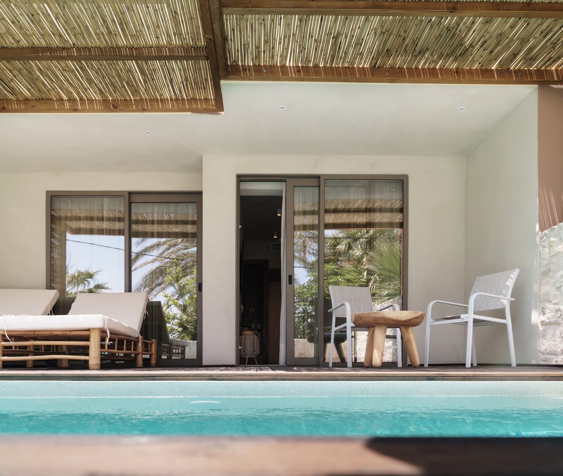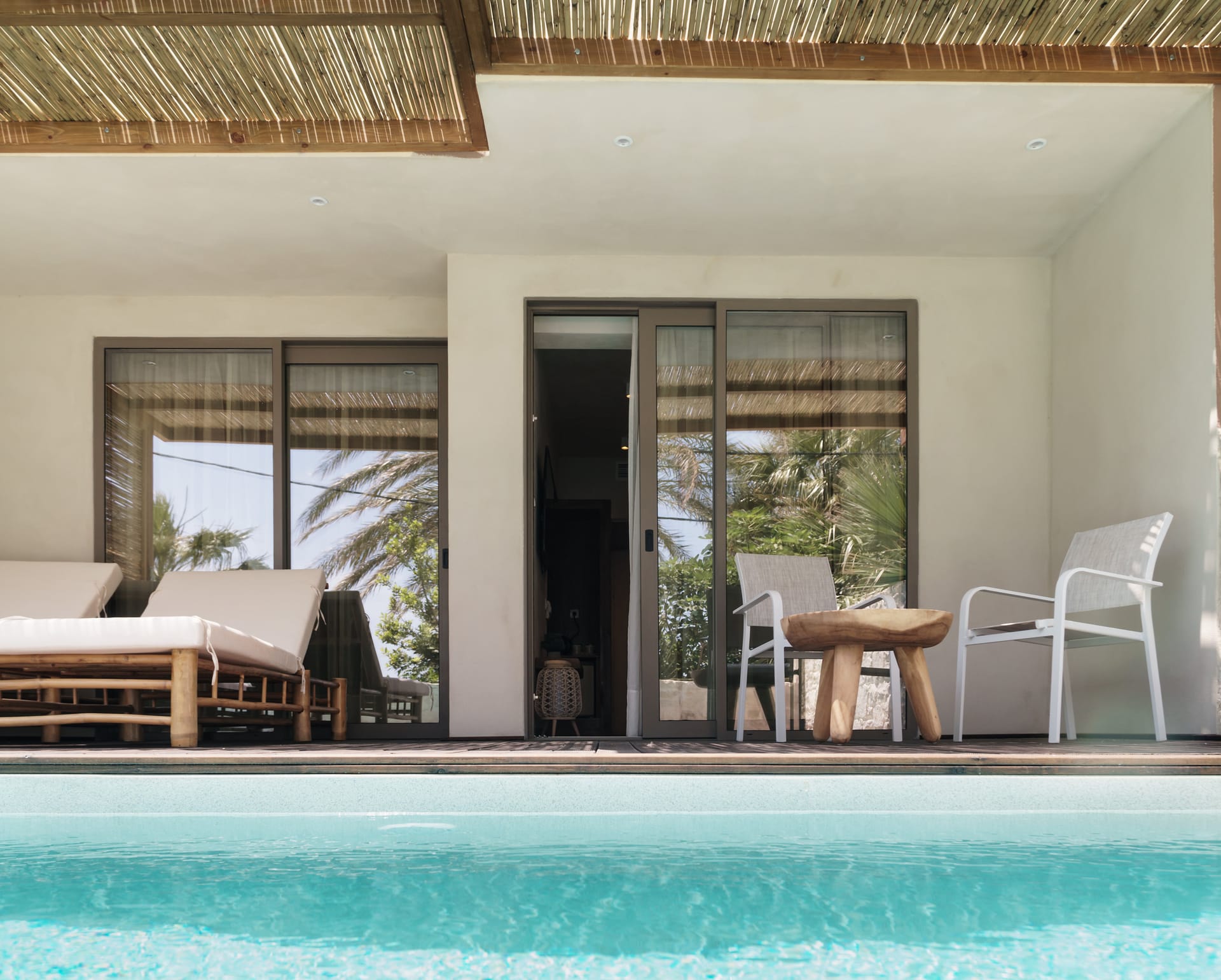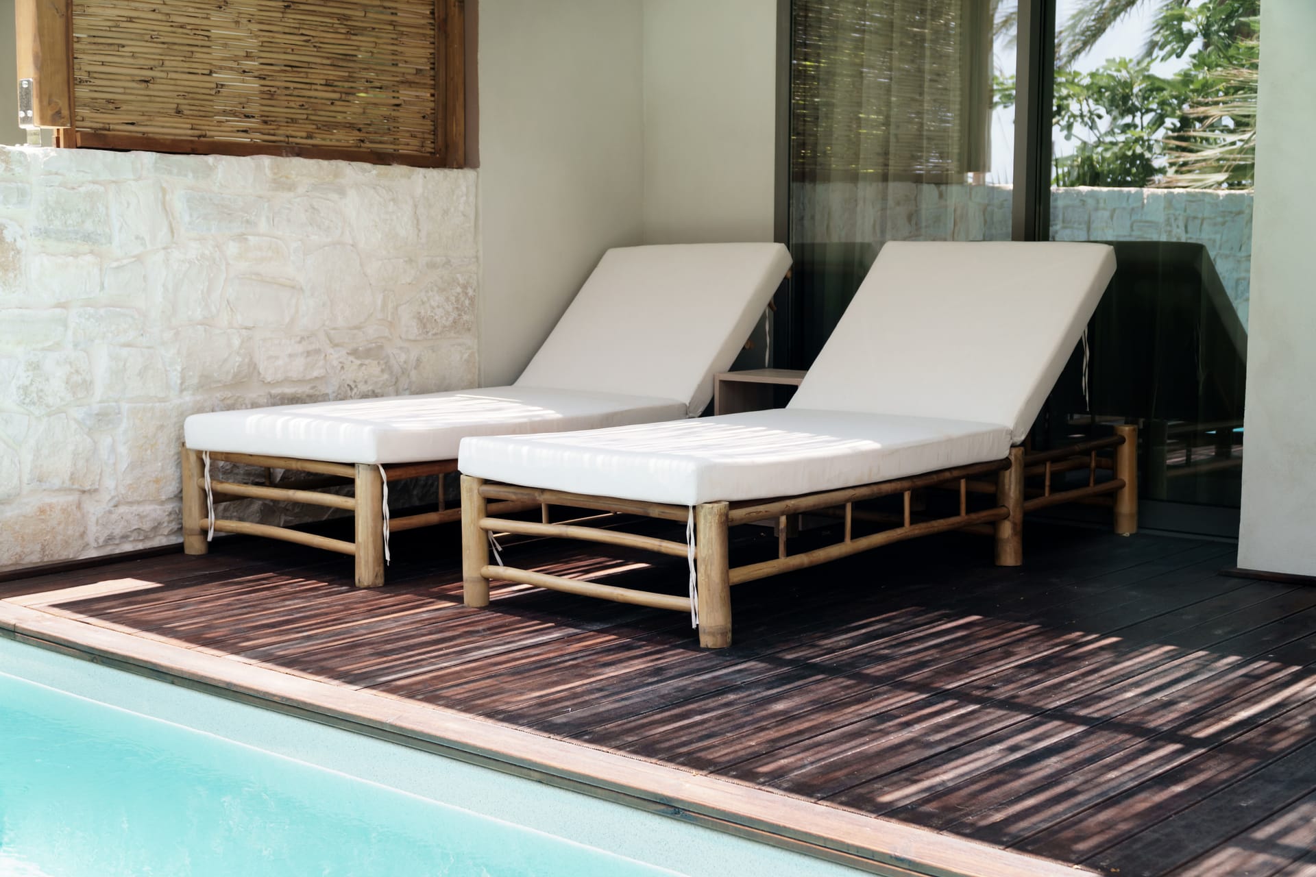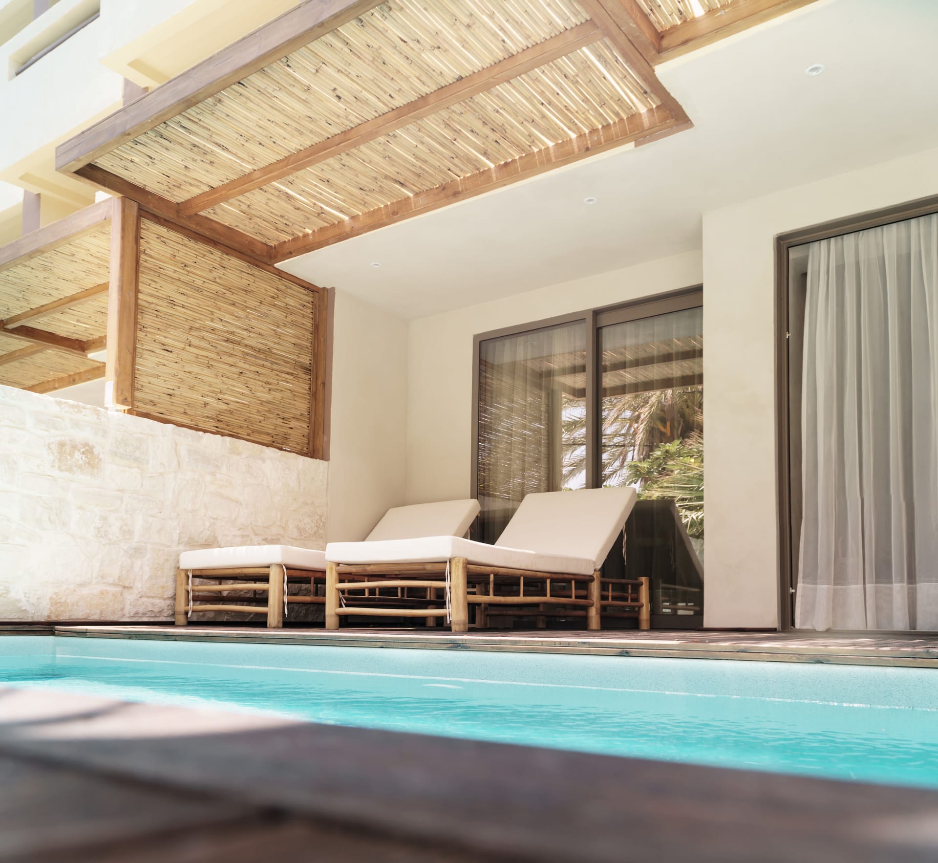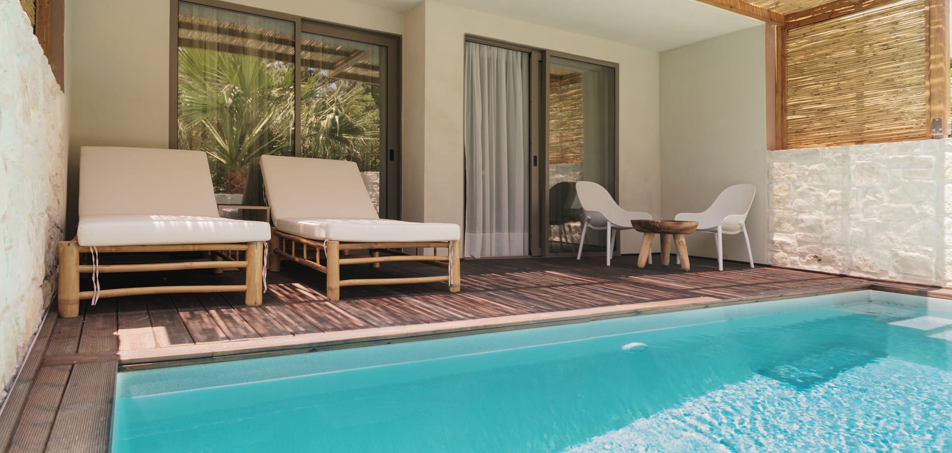 Pool area: Adjacent to the room, you'll find a private exterior area complete with sunbeds stunning pool area, which spans 10 square meters. The pool offers a refreshing and tranquil space where you can unwind and enjoy a swim at your leisure. This secluded space allows you to relax and bask in the sun, surrounded by the beauty of nature. Unwind on the sunbeds, read a book, or simply enjoy the peacefulness of your private oasis.