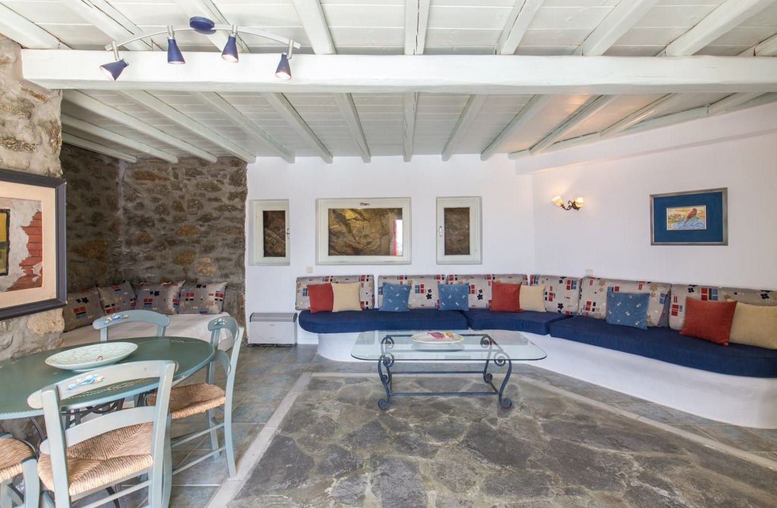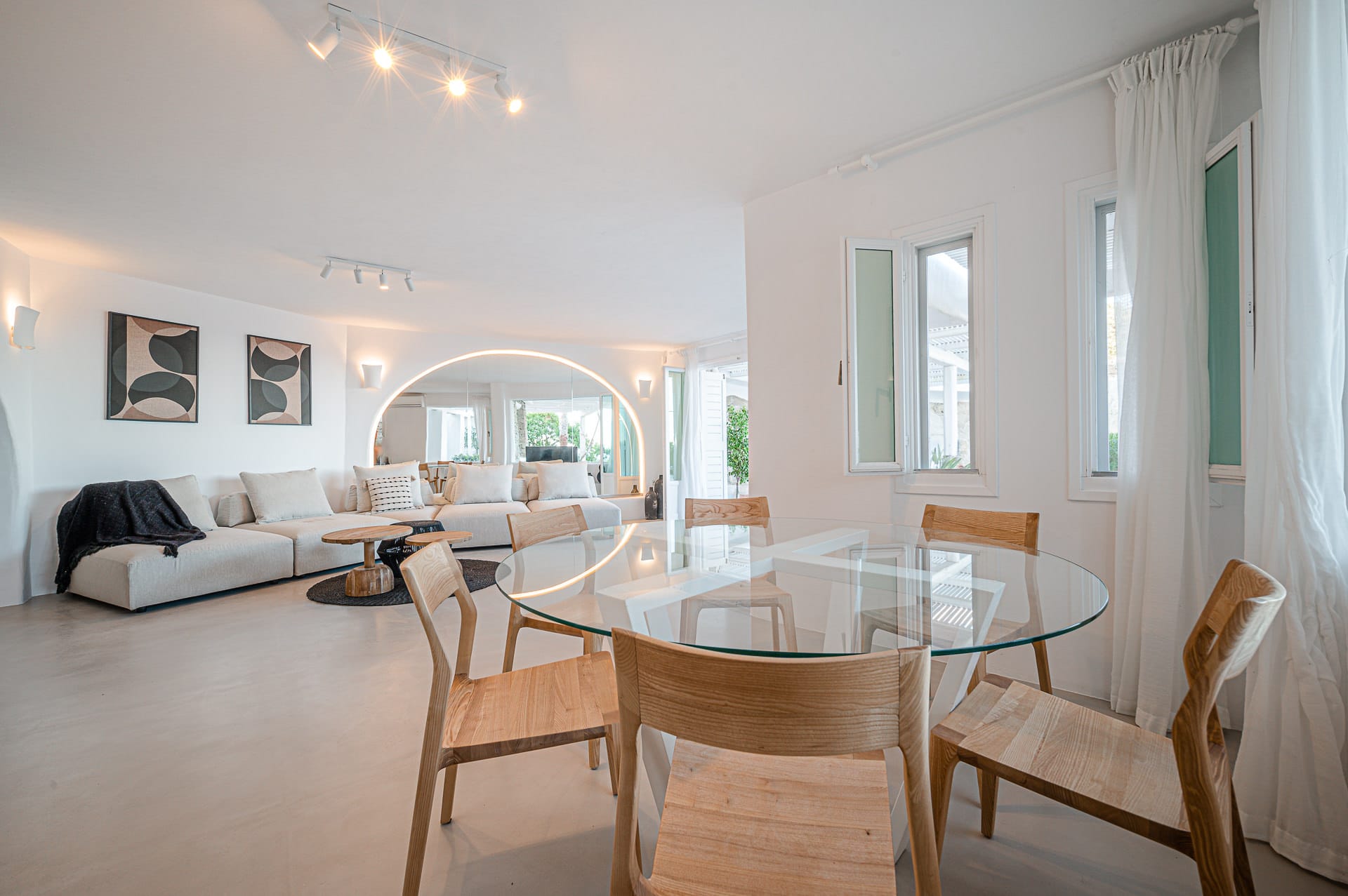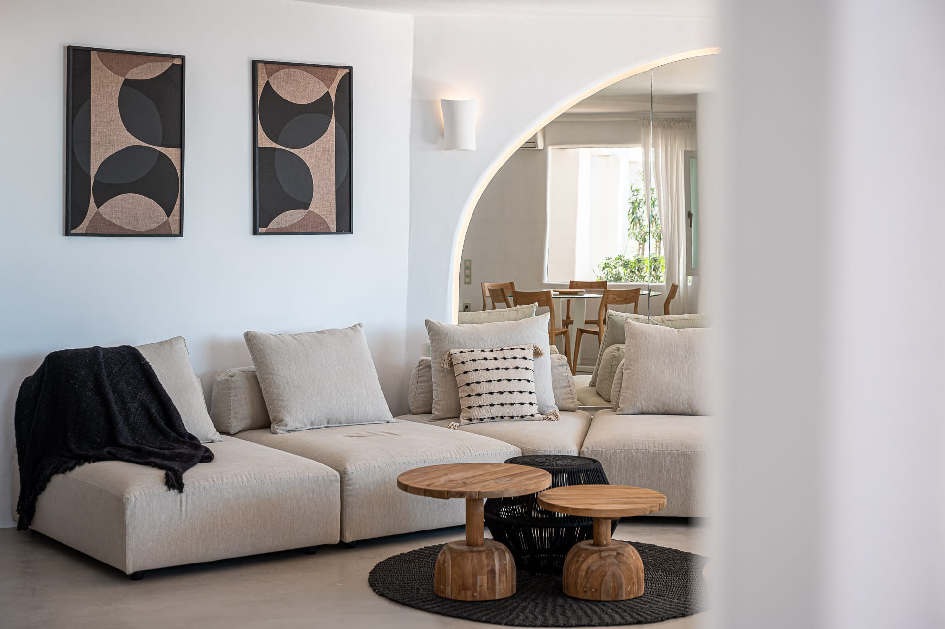 The Cycladic Mykonian architecture of this beautiful villa, in combination with the modern furniture, creates an elegant result as well as an impressive atmosphere.