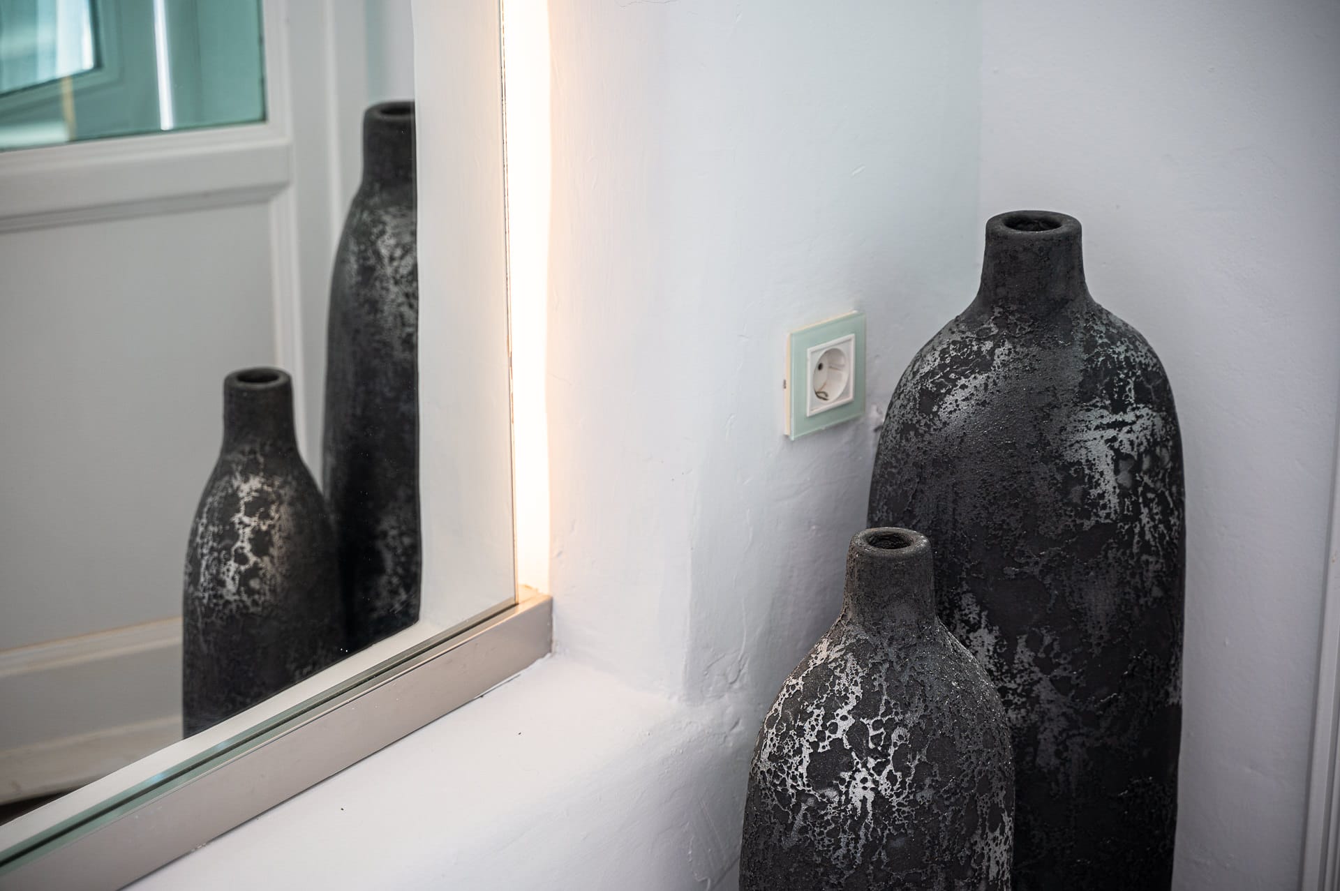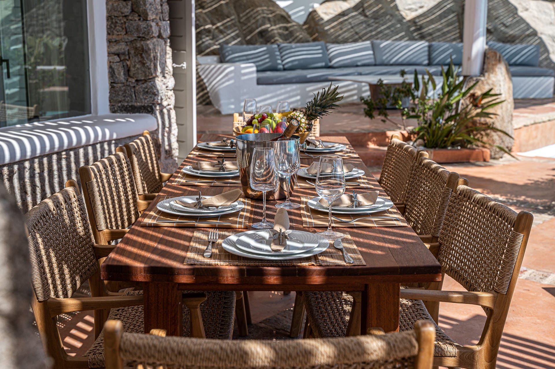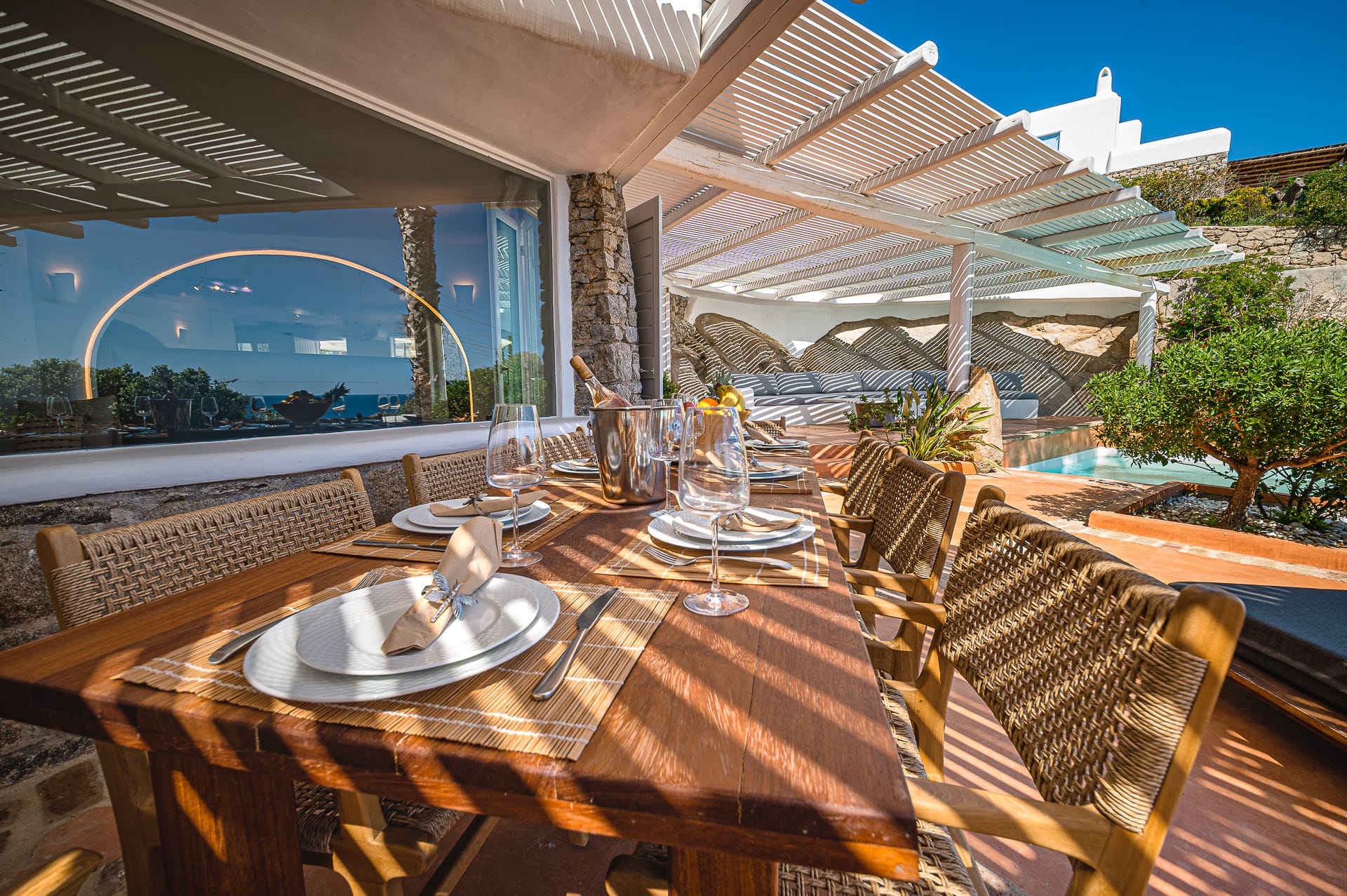 The Cycladic Mykonian architecture of this beautiful villa, in combination with the modern furniture, creates an elegant result as well as an impressive atmosphere.