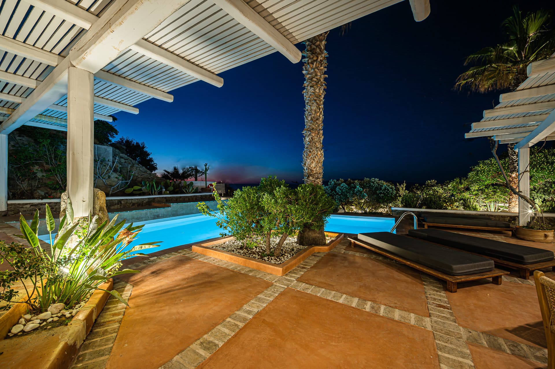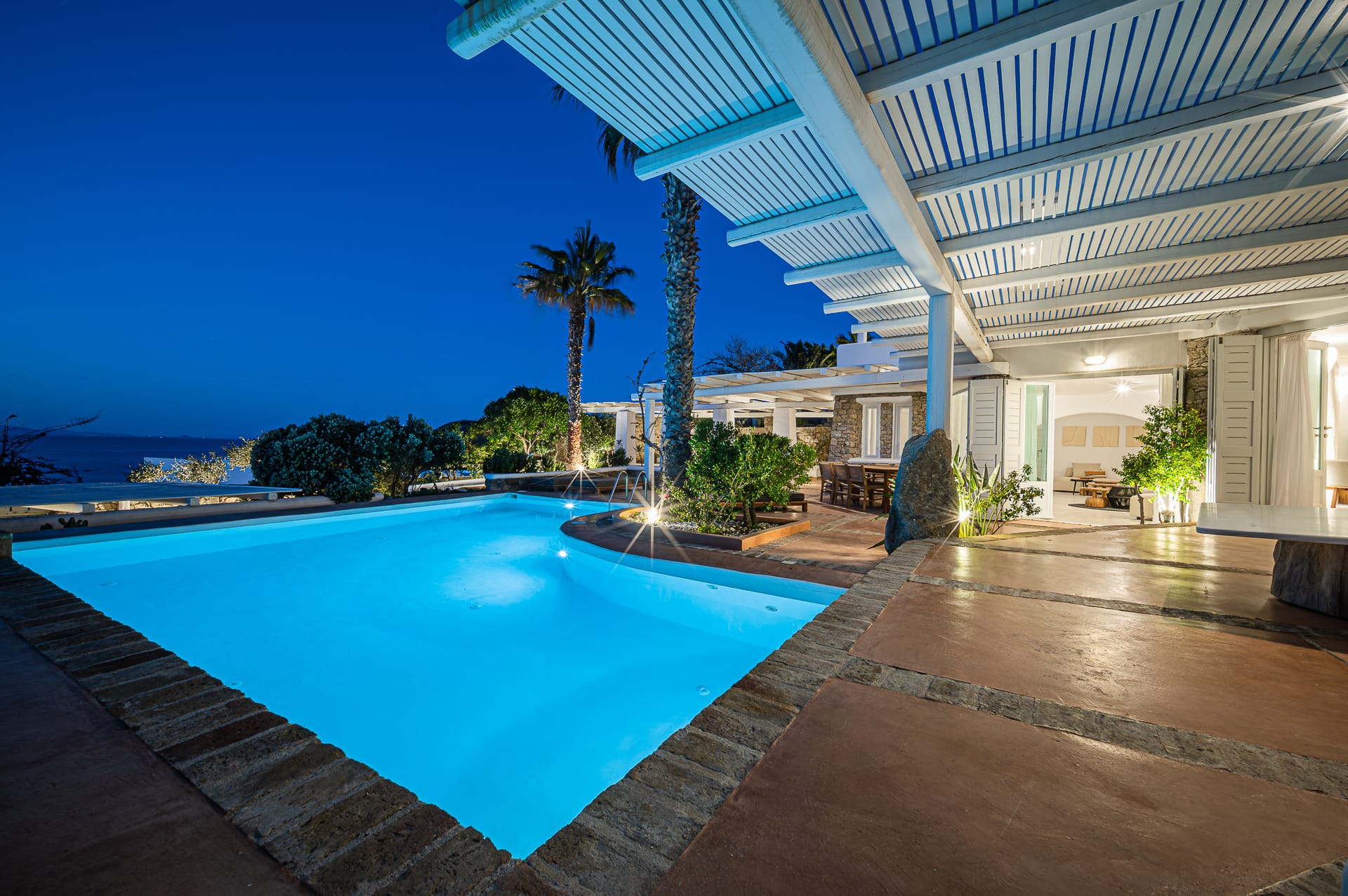 The 50 sq. meters infinity pool overlooking the Aegean sea dominates the grounds together with the sizeable dining area seating 8 people as well as seating areas with beautiful pergolas which provide shade predispose the guests to enjoy ideal moments of relaxation during the day or organize a romantic dinner or a cocktail event with the residents in the evening. The extraordinary grounds of this villa harmoniously combine the elements of nature with the fully-grown trees encircling the spacious infinity swimming–pool creating thus a heavenly environment.