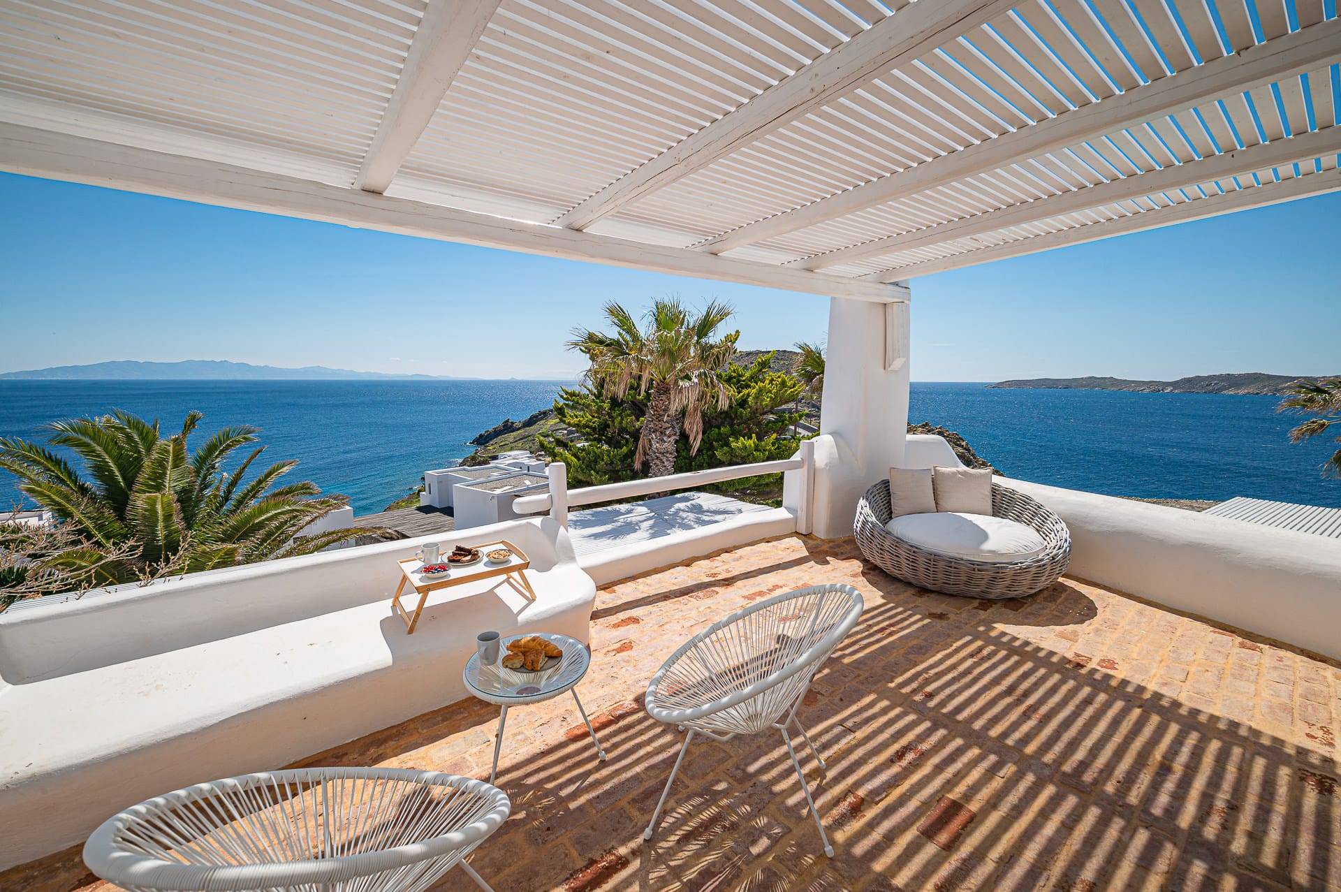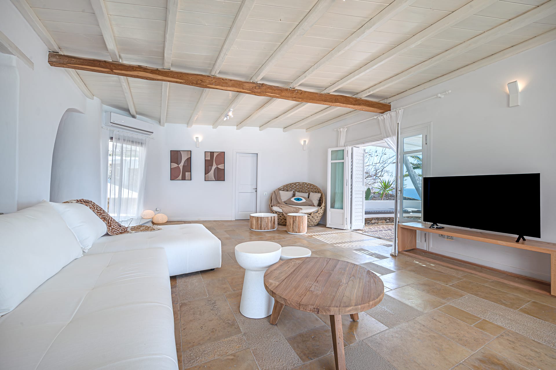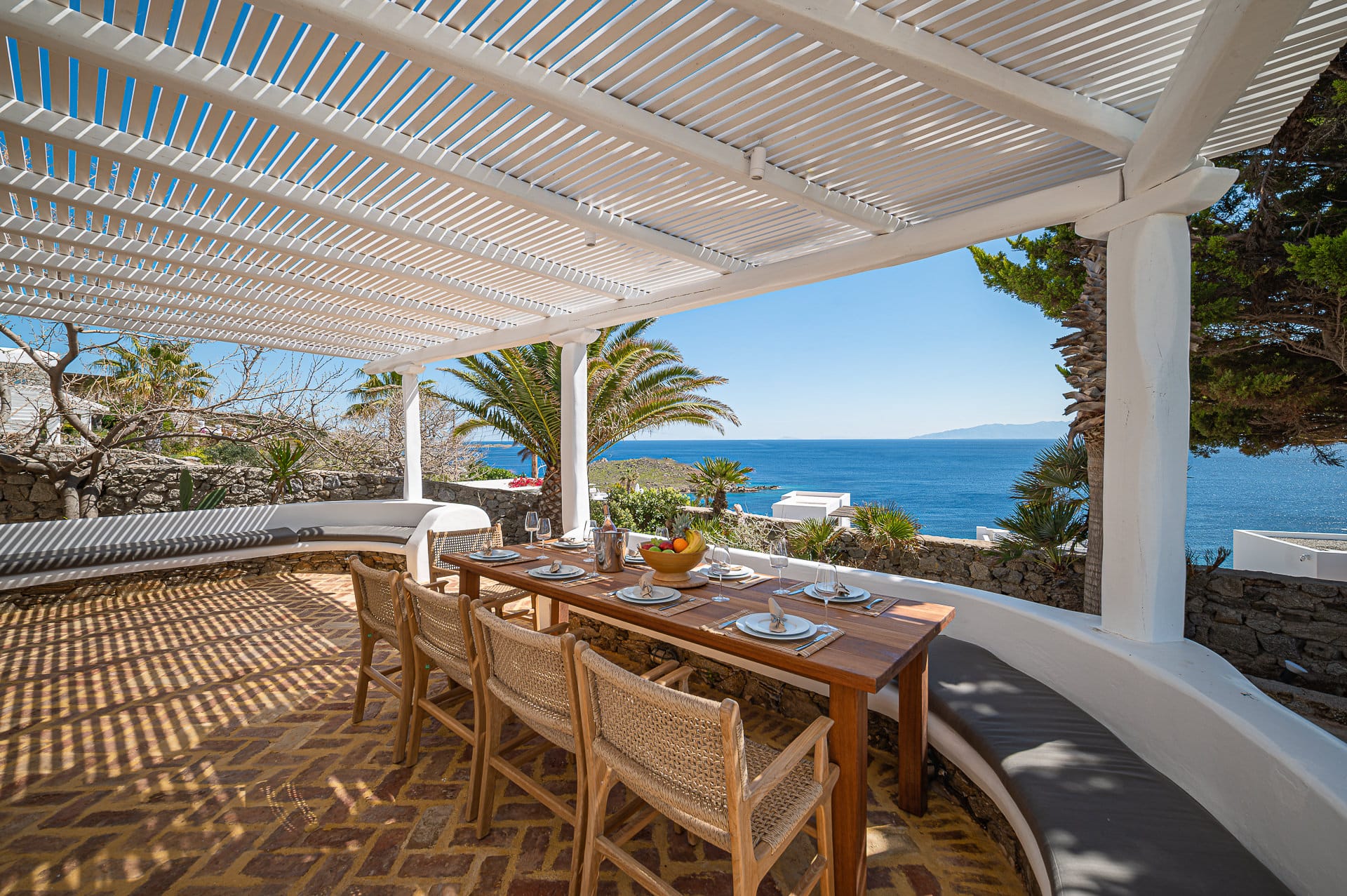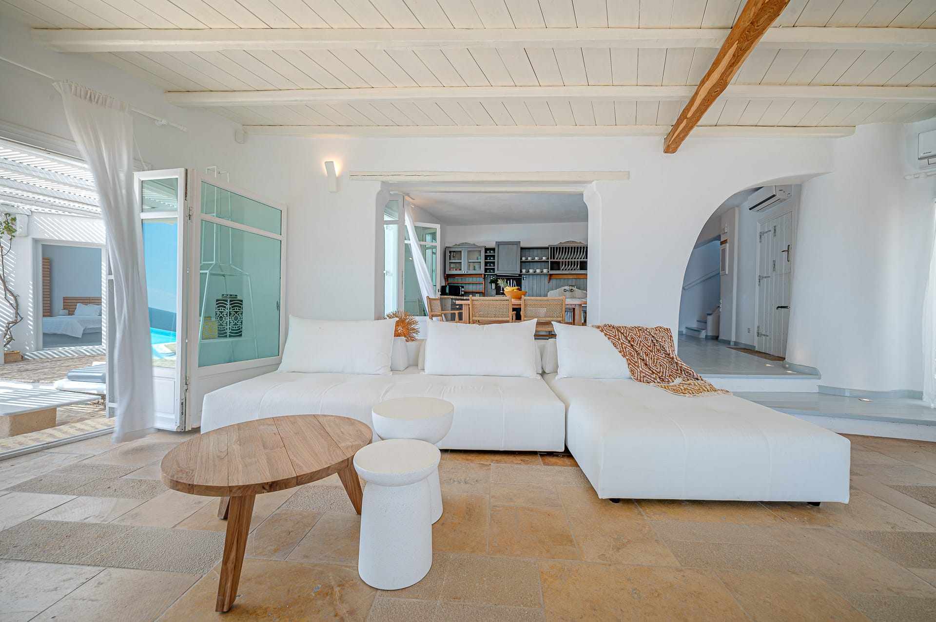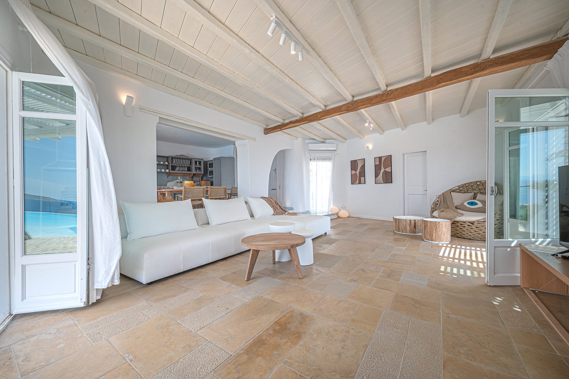 The Cycladic Mykonian architecture of this beautiful villa, in combination with the modern furniture, creates an elegant result as well as an impressive atmosphere.