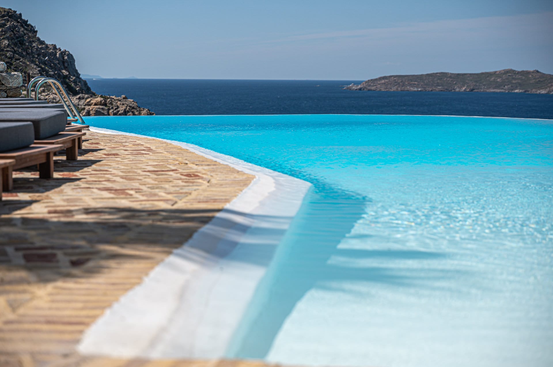 The 70 sq. meters infinity pool overlooking the Aegean sea dominates the grounds together with the sizeable dining area seating 8 people as well as seating areas with beautiful pergolas which provide shade predispose the guests to enjoy ideal moments of relaxation during the day or organize a romantic dinner or a cocktail event with the residents in the evening. The extraordinary grounds of this villa harmoniously combine the elements of nature with the fully-grown trees encircling the spacious infinity swimming–pool creating thus a heavenly environment.