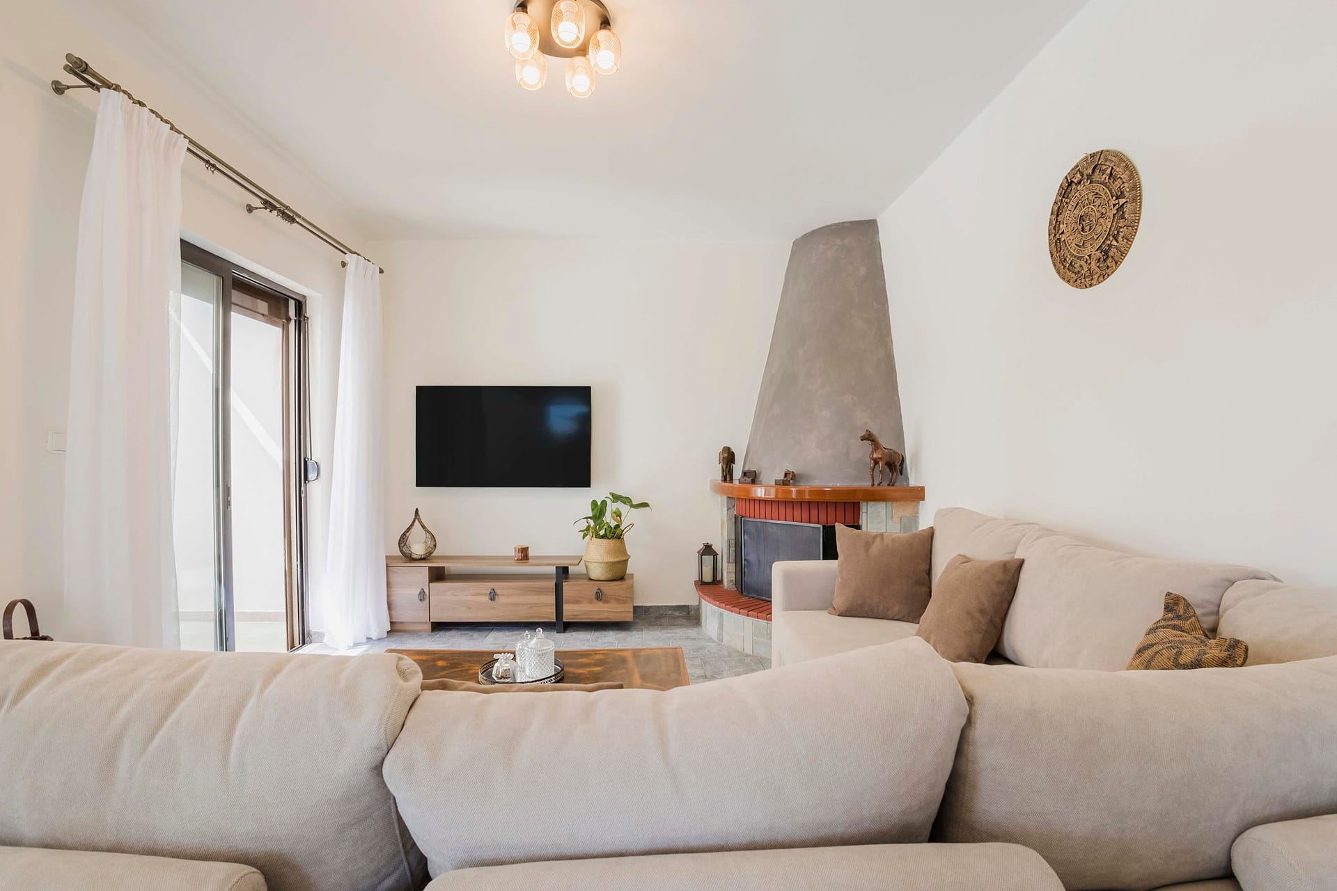 Ascend to the first floor, where you will encounter one more living room and dining room both opening to a shaded furnished balcony and ample view towards the garden and swimming pool. The master bedroom with double bed and double sofa bed as well as fireplace and bathroom with Jacuzzi bathtub along with two more bedrooms both with double beds and a bathroom with bathtub can be found here.
