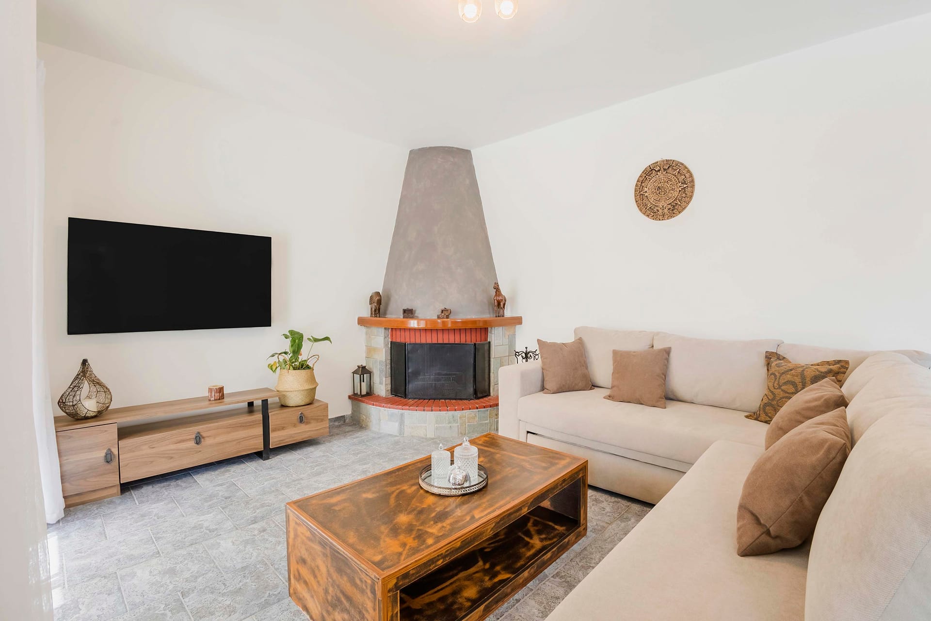 At the ground floor, there are 3 bedrooms, one with double bed, separate entrance and bathroom with shower right next to it. Two more interconnected bedrooms one with double bed and one with two singles can be isolated from the rest rooms through a door. Also at the ground floor there is the main living room and dining room as well as the fully equipped spacious kitchen and a bathroom with Jacuzzi bathtub.