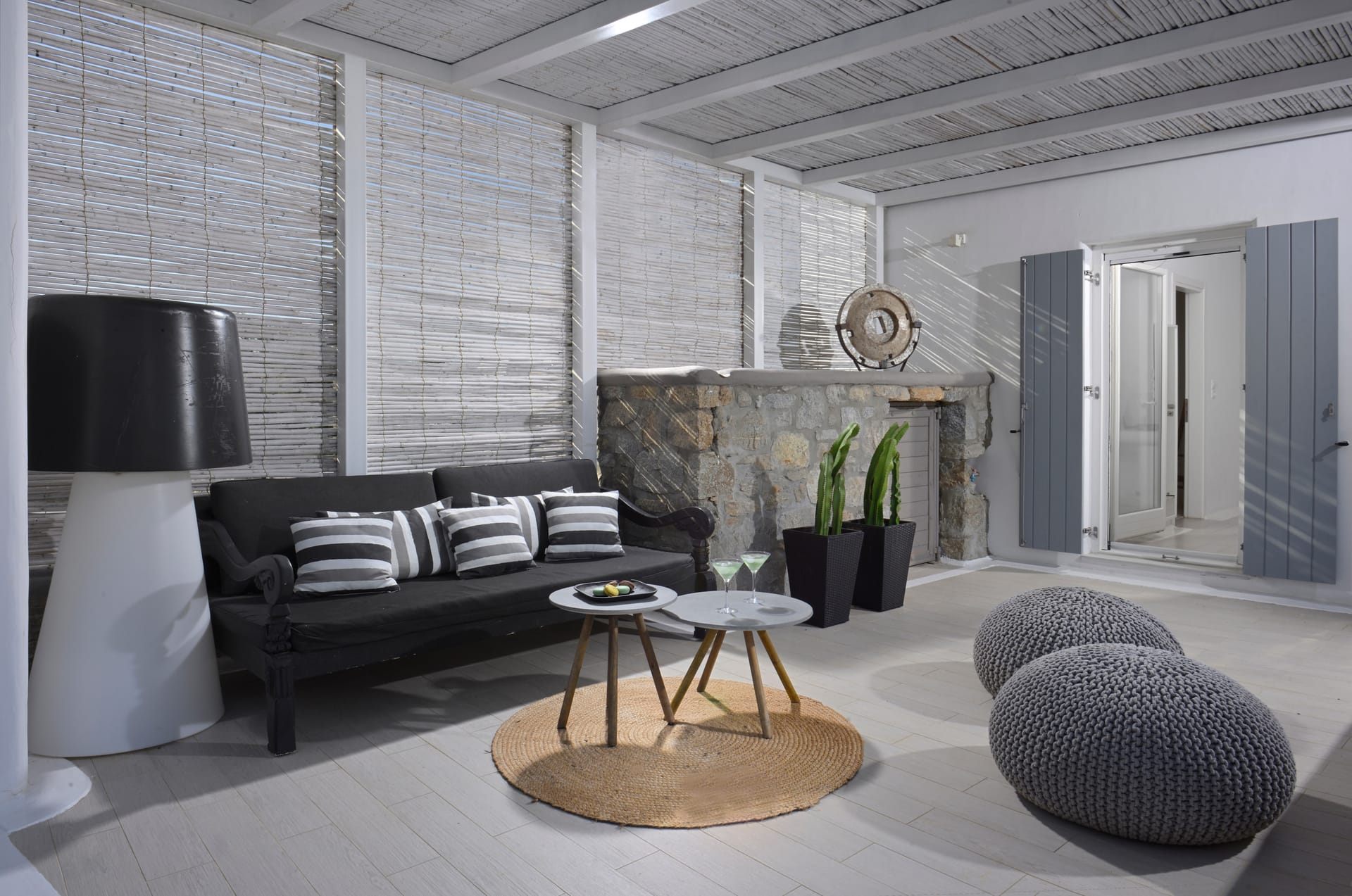 Indoor and outdoor luxury is foremost in this villa to delight in Mykonos style. The grand covered outdoor terrace commands a spectacular view which you can enjoy seated in the comfortable outdoor living area. Inside, enjoy casual snacks or morning coffee at the breakfast table next to the modern kitchen. Fully equipped, the kitchen has everything you need to prepare a feast for your guests. The indoor dining area and living room are open and spacious with windows and doors which open to the view.