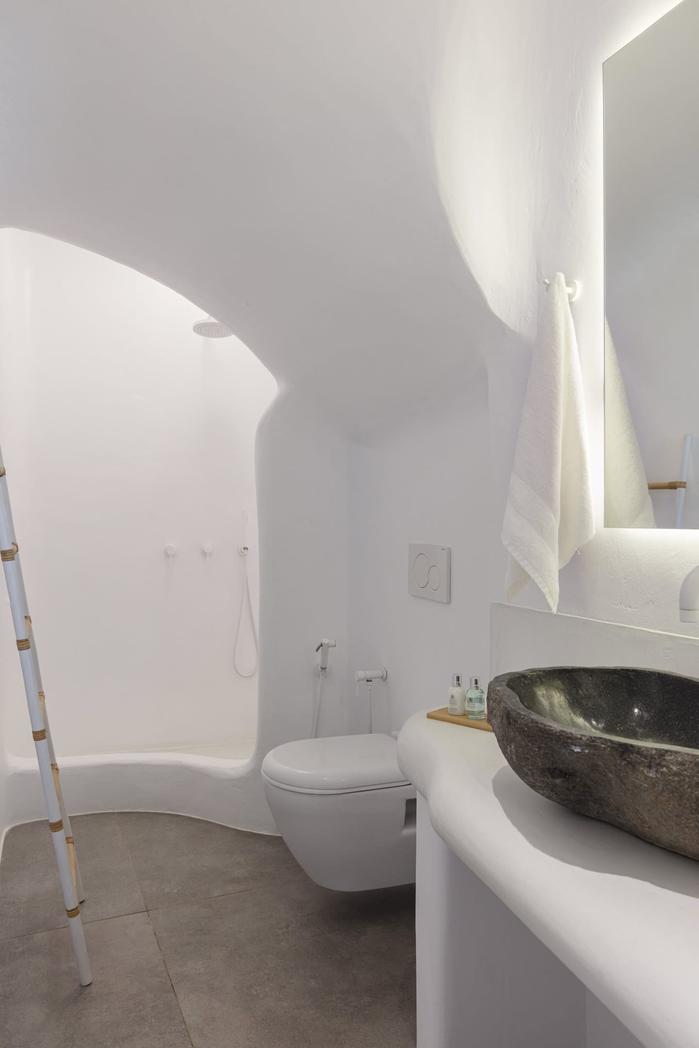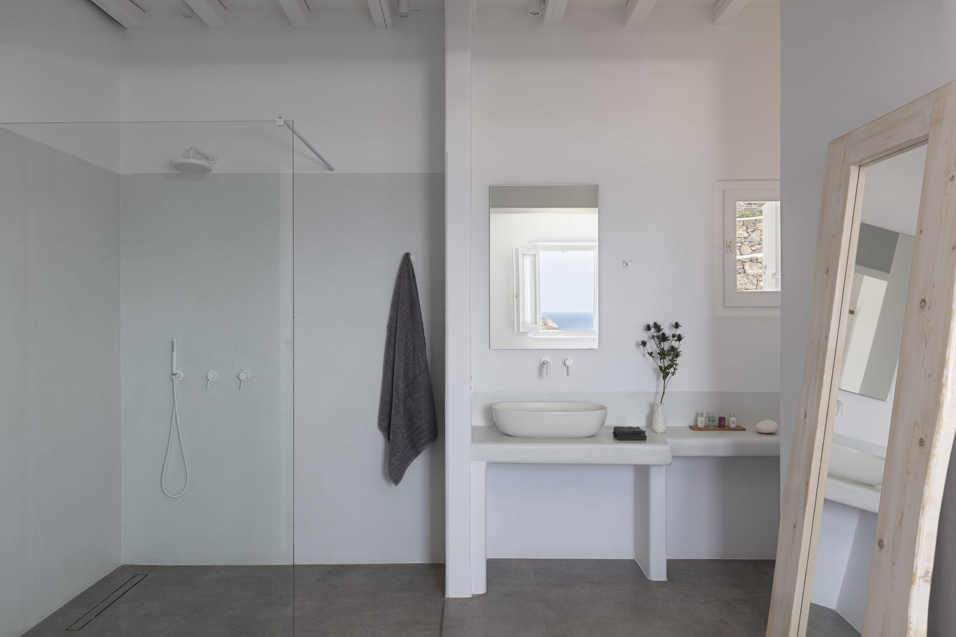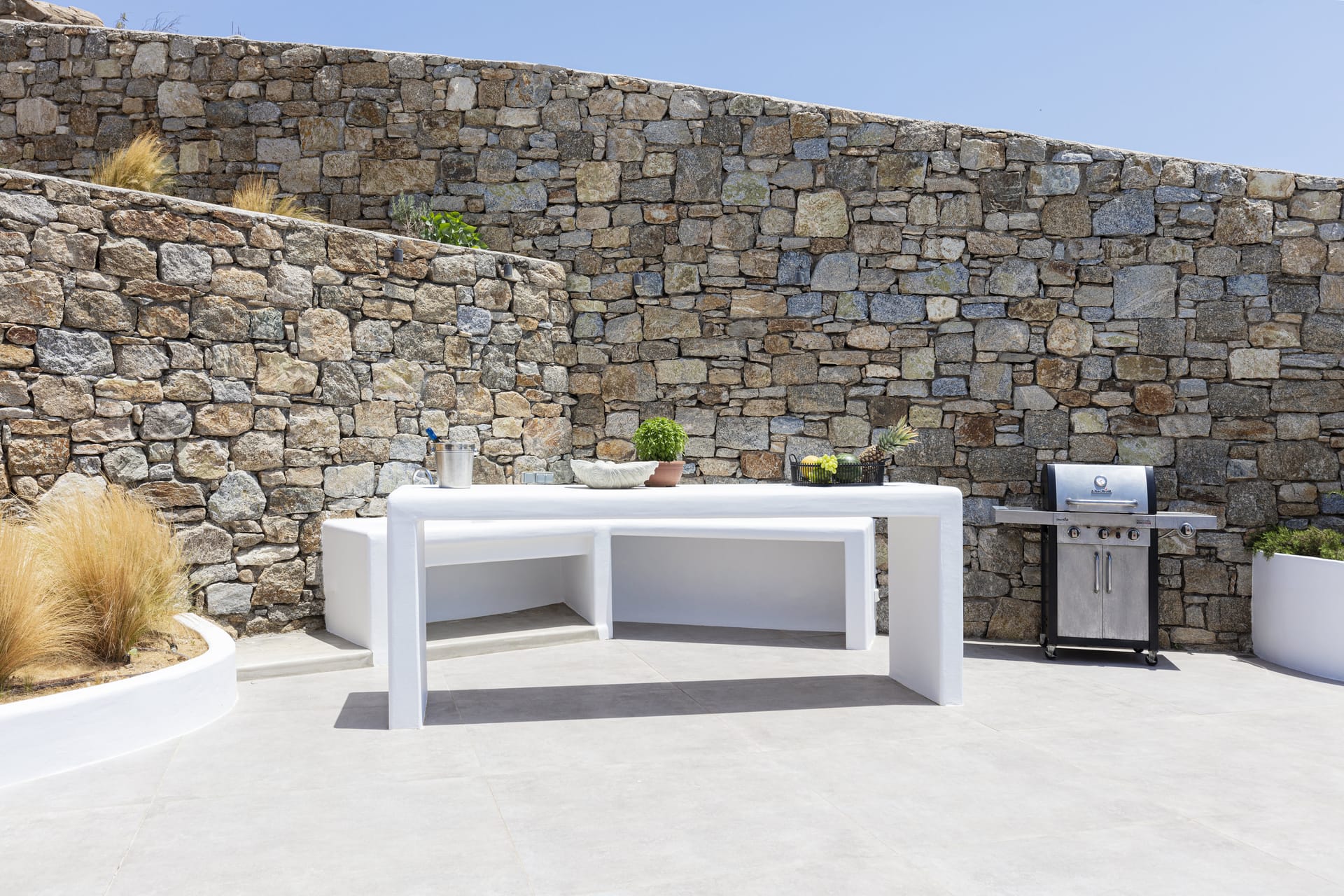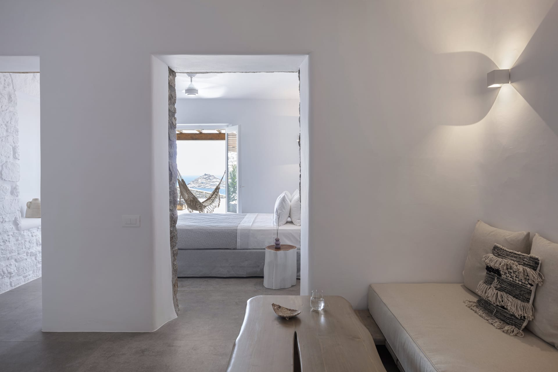 This luxury accommodation will ensure you experience seamless holidays during your stay in Mykonos. Its modern and minimal architectural style contributes to the perfect harmony of the unspolied landscapes of the island. The prevailed white colors in combination with rocky walls reflects the beauty of the nature and the simplicity of the local life. The unique interior design conveys a sense of exclusivity and ease, whille many windows offer grand views, that will make you "travel" on the waves of the Aegean Sea. The spacious outdoor area serves as an extension of the pleasure that you will indulge in, enjoying absolute moments of delight. All in all, this property will be your oasis that will guarantee you privacy and careless vacation with your family or group of friends.