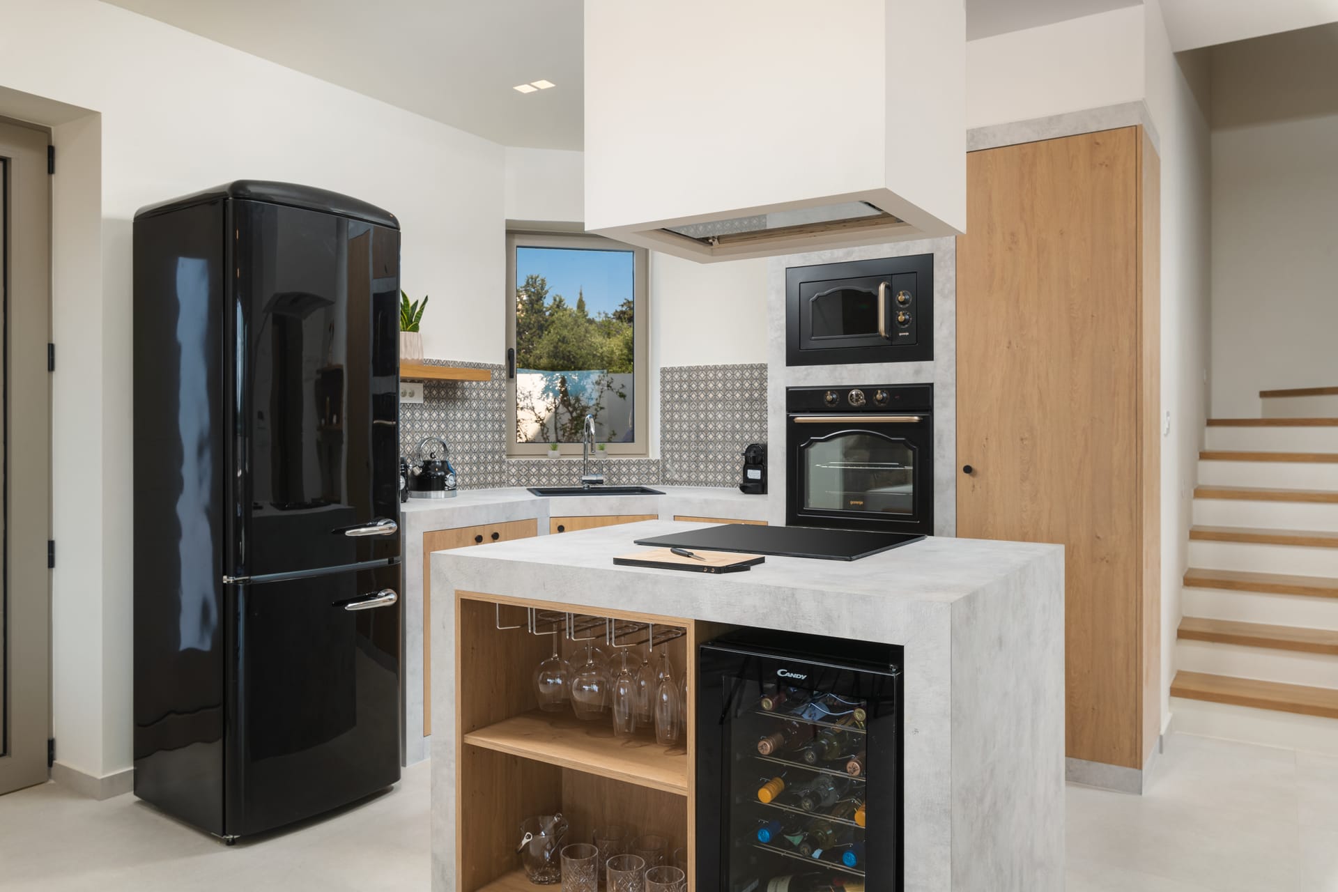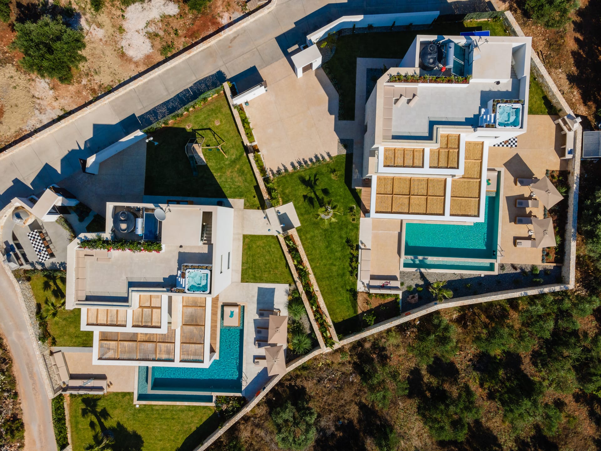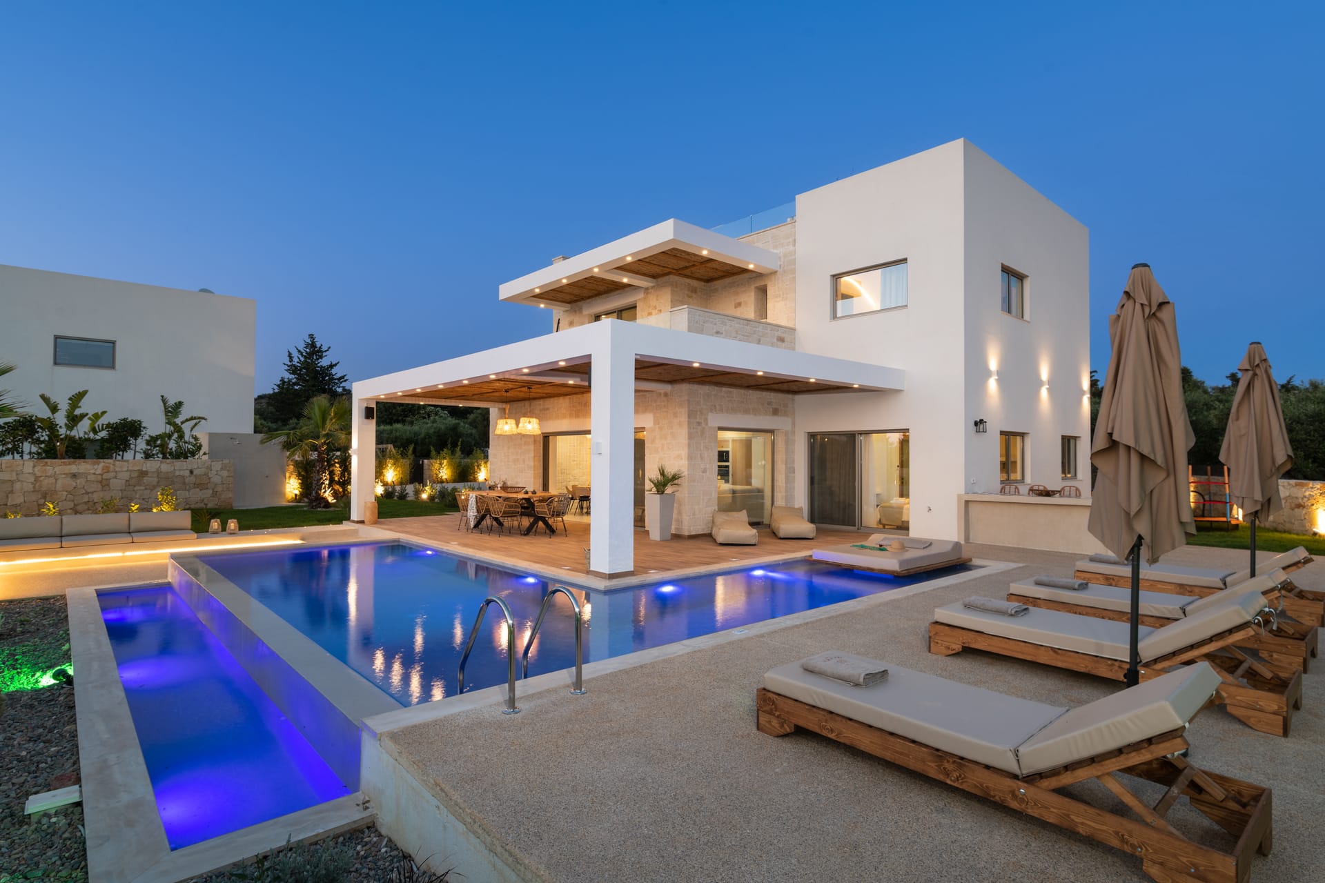 Step outside onto your private courtyard, adorned with lush greenery and featuring direct access from all the rooms. Here, you'll find your own oasis - a refreshing private pool, flanked by comfortable loungers and shaded by an umbrella, perfect for soaking up the Mediterranean sun in blissful seclusion.