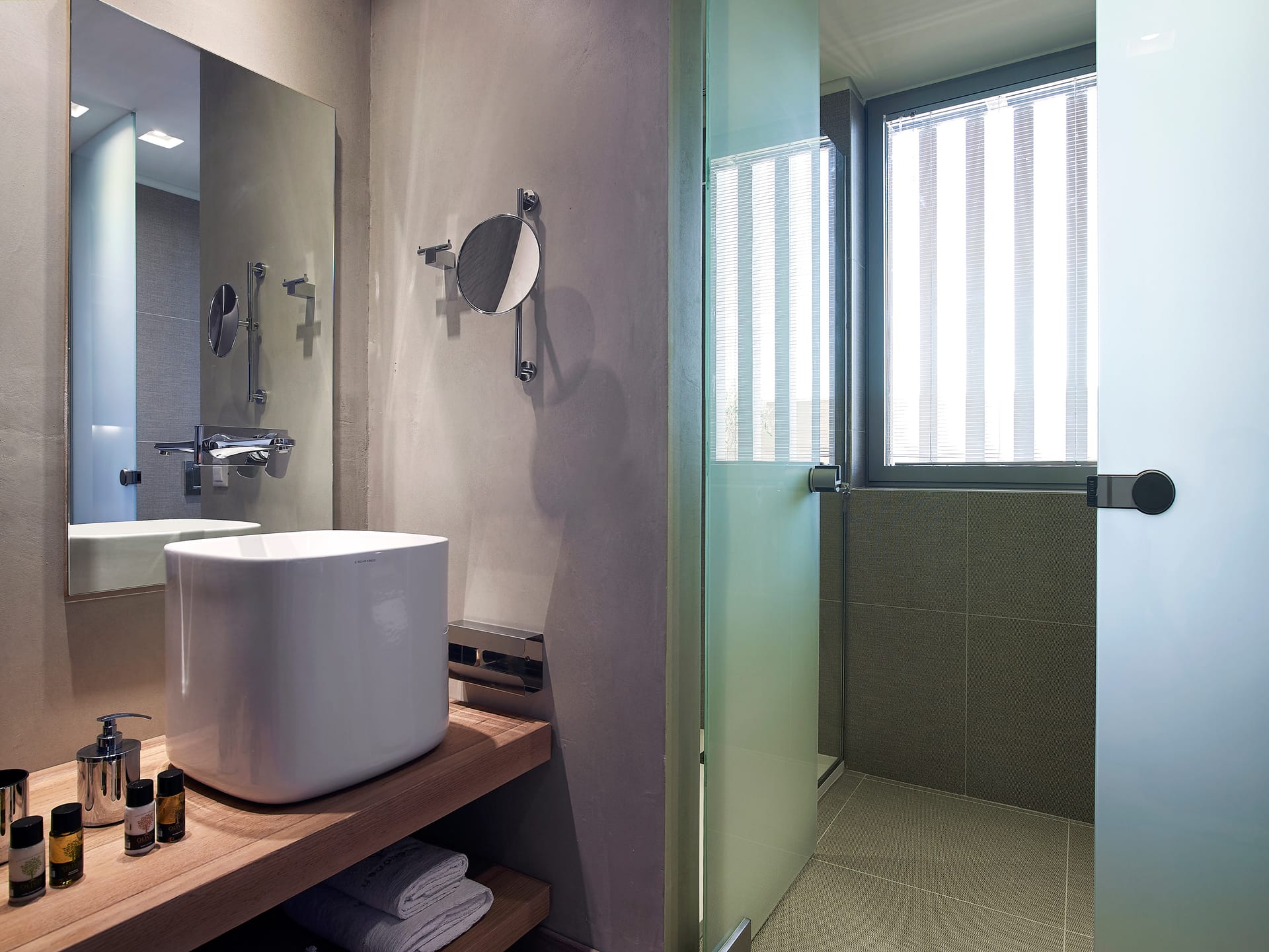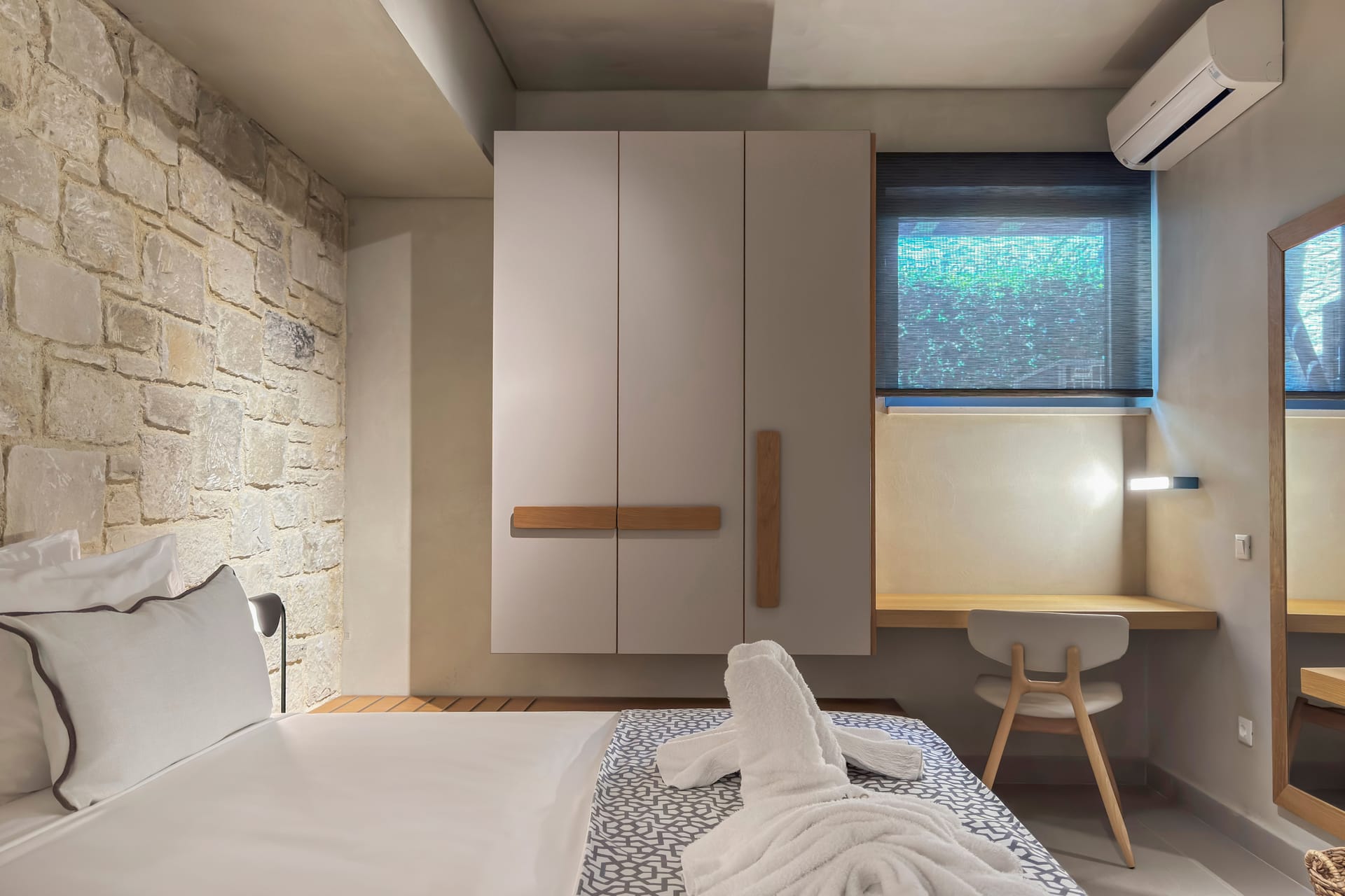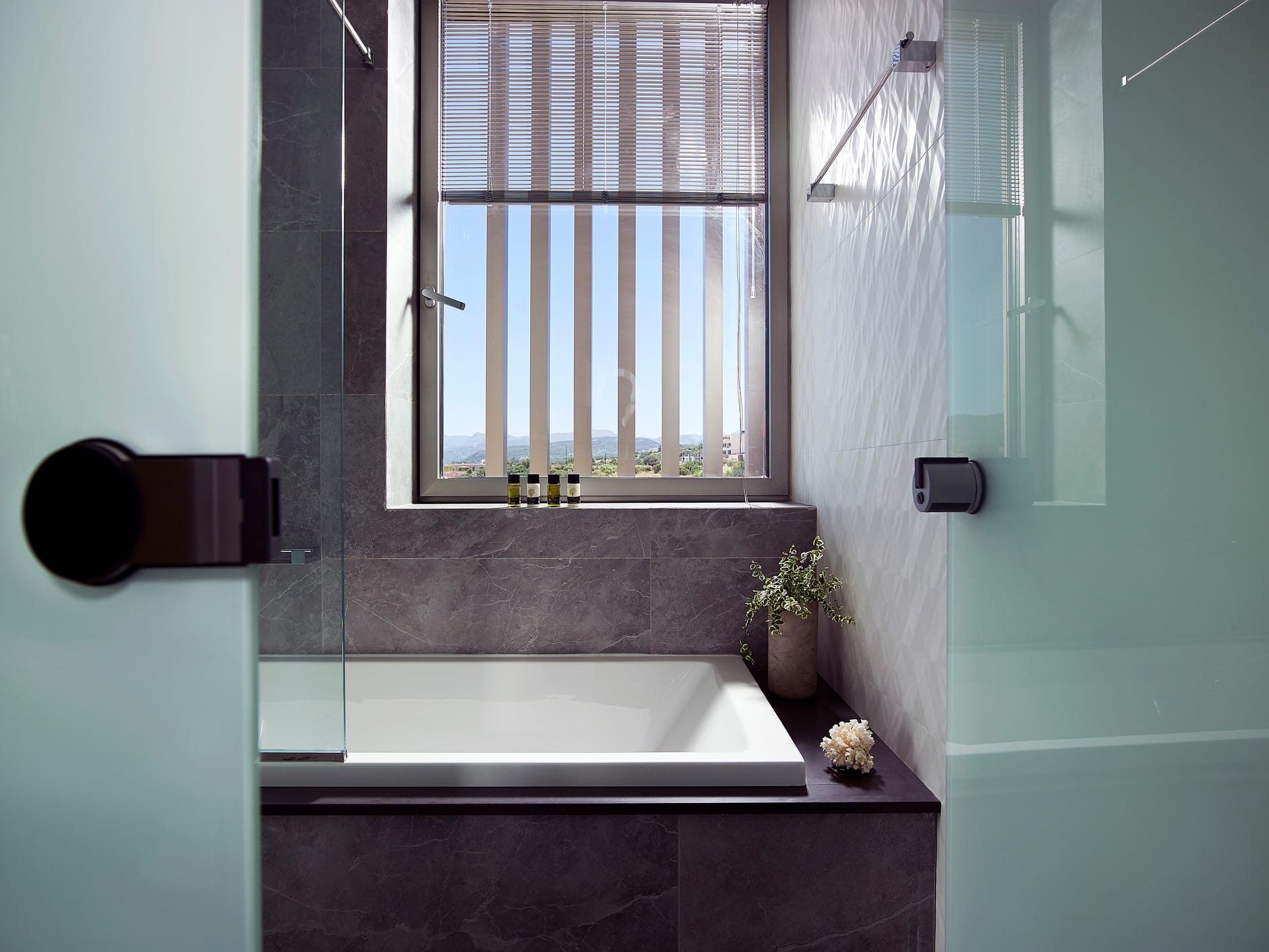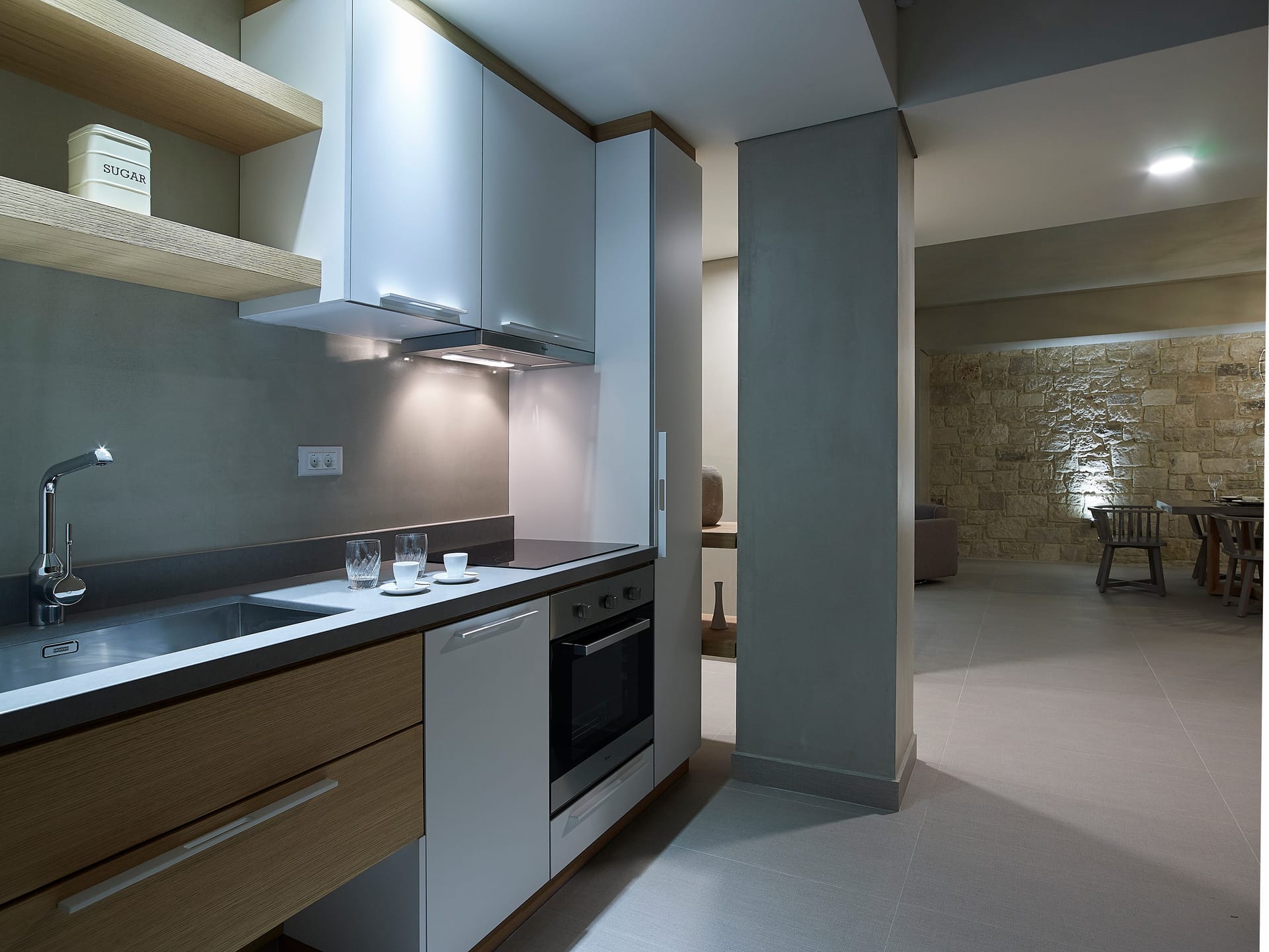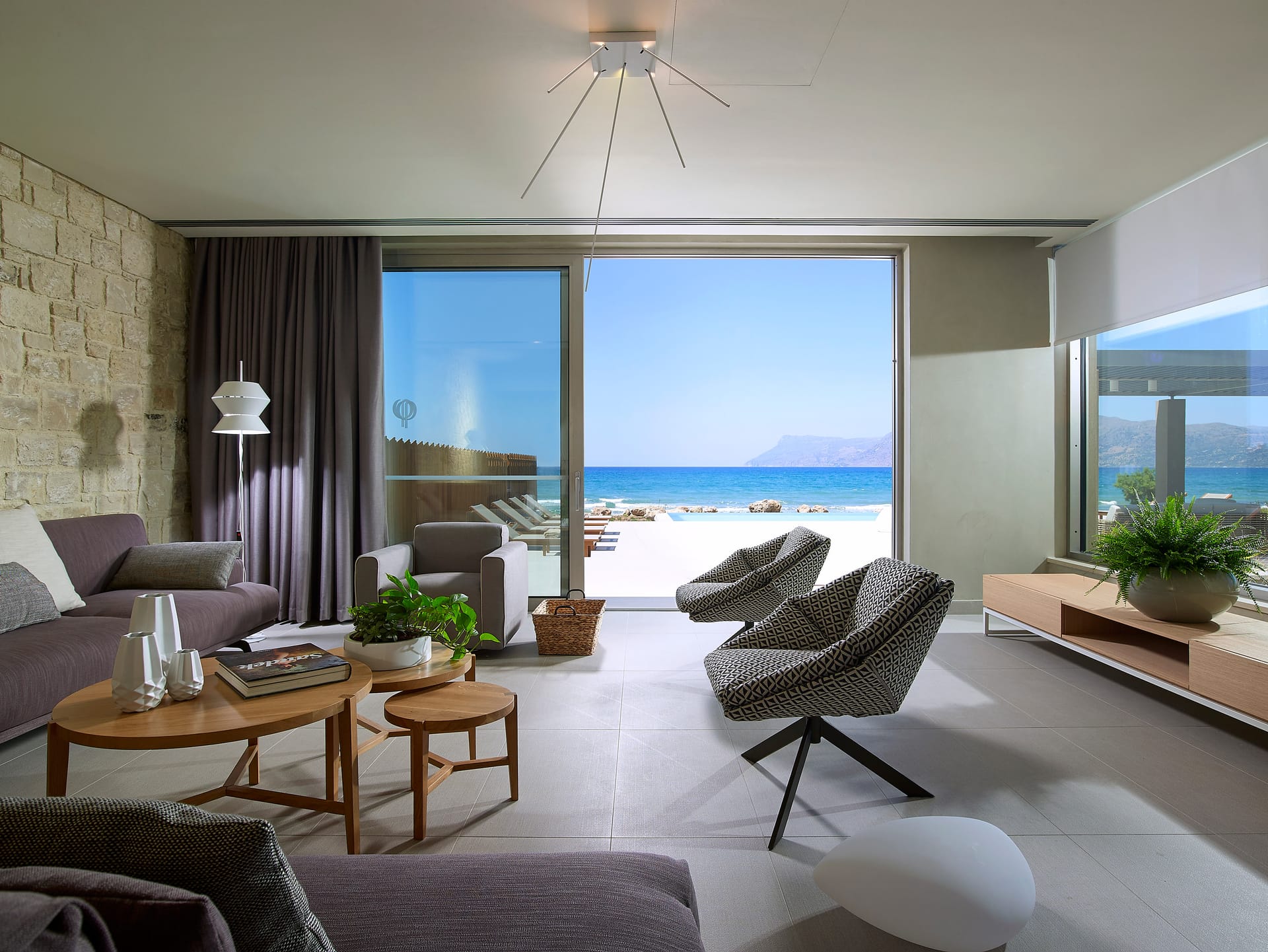 Modern and minimal in style, this Youphoria property – on the shore at Korfalonas – features clean lines, high-quality furnishings, luxurious comfort, and uses natural colours and materials such as local limestone and wood.