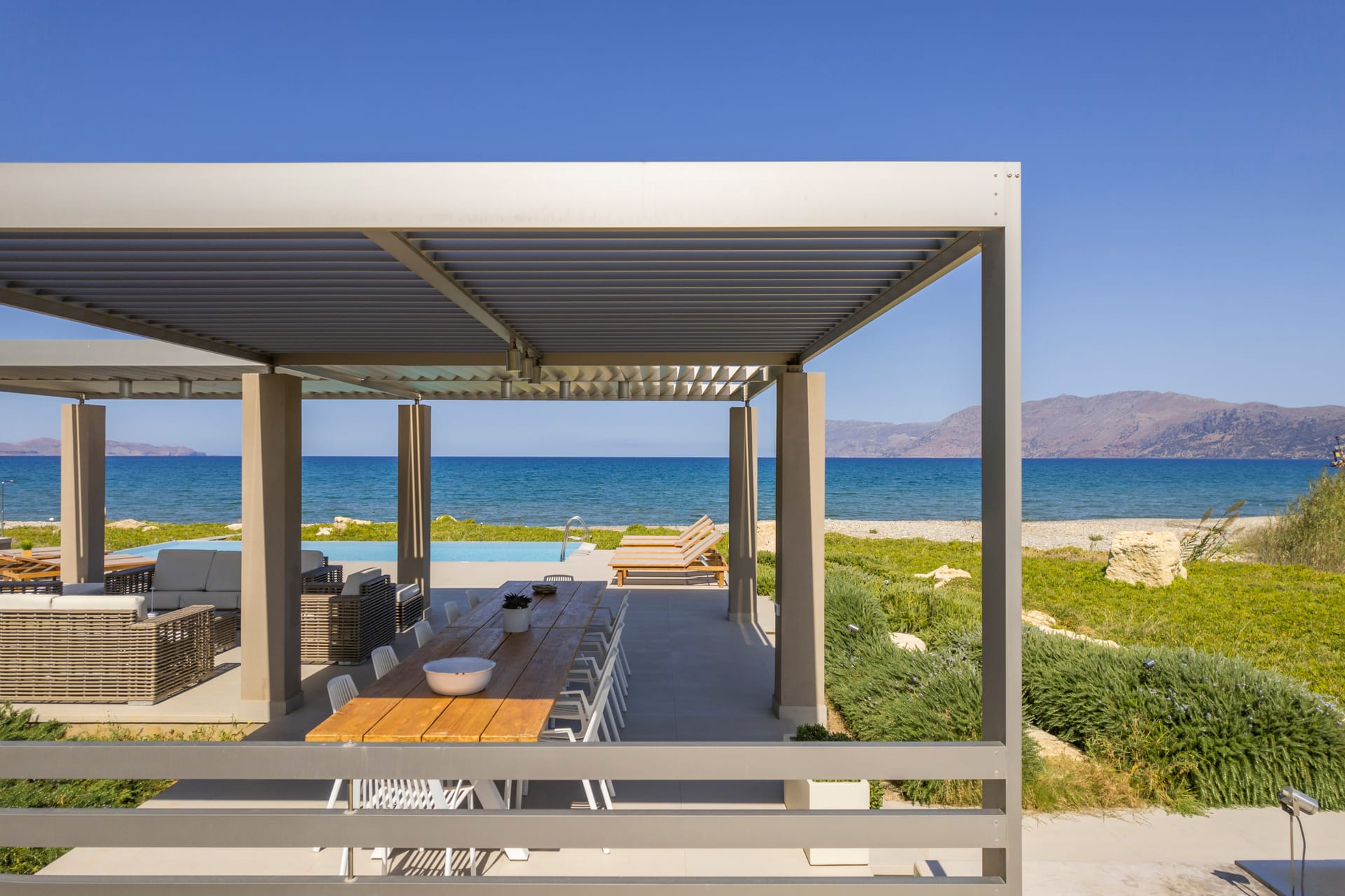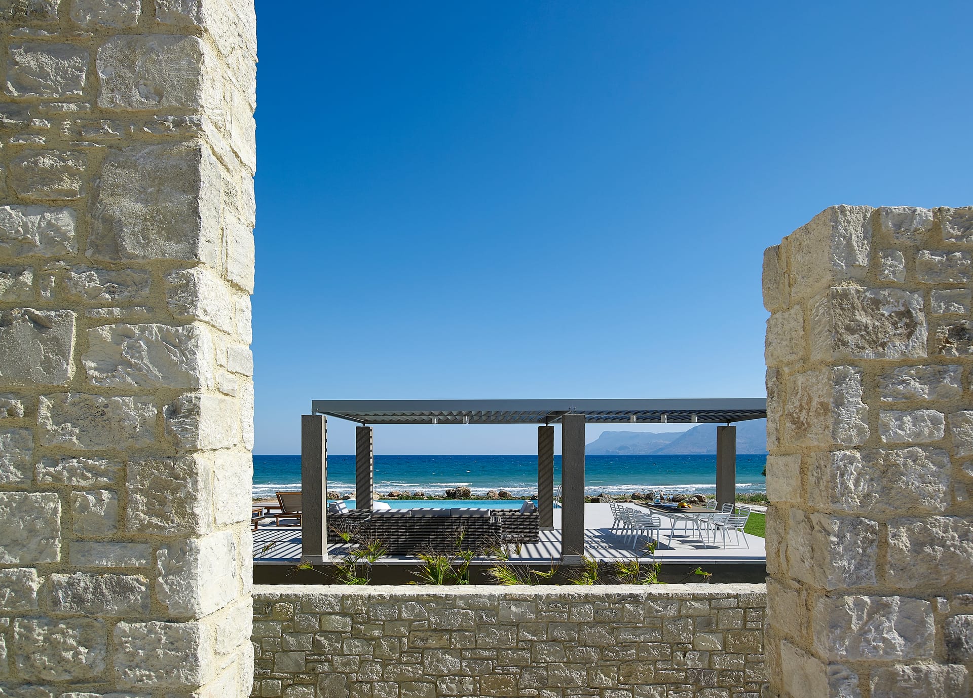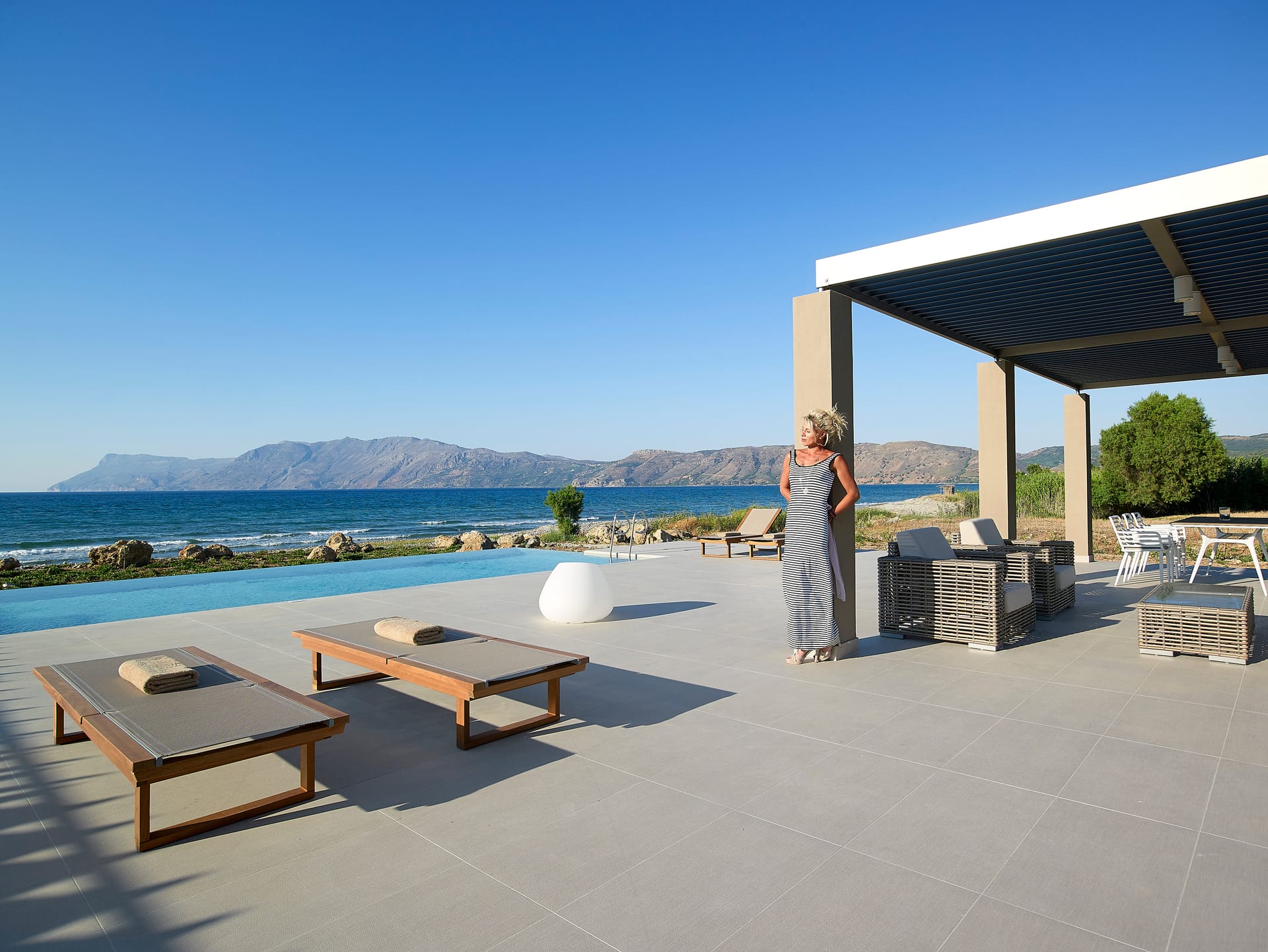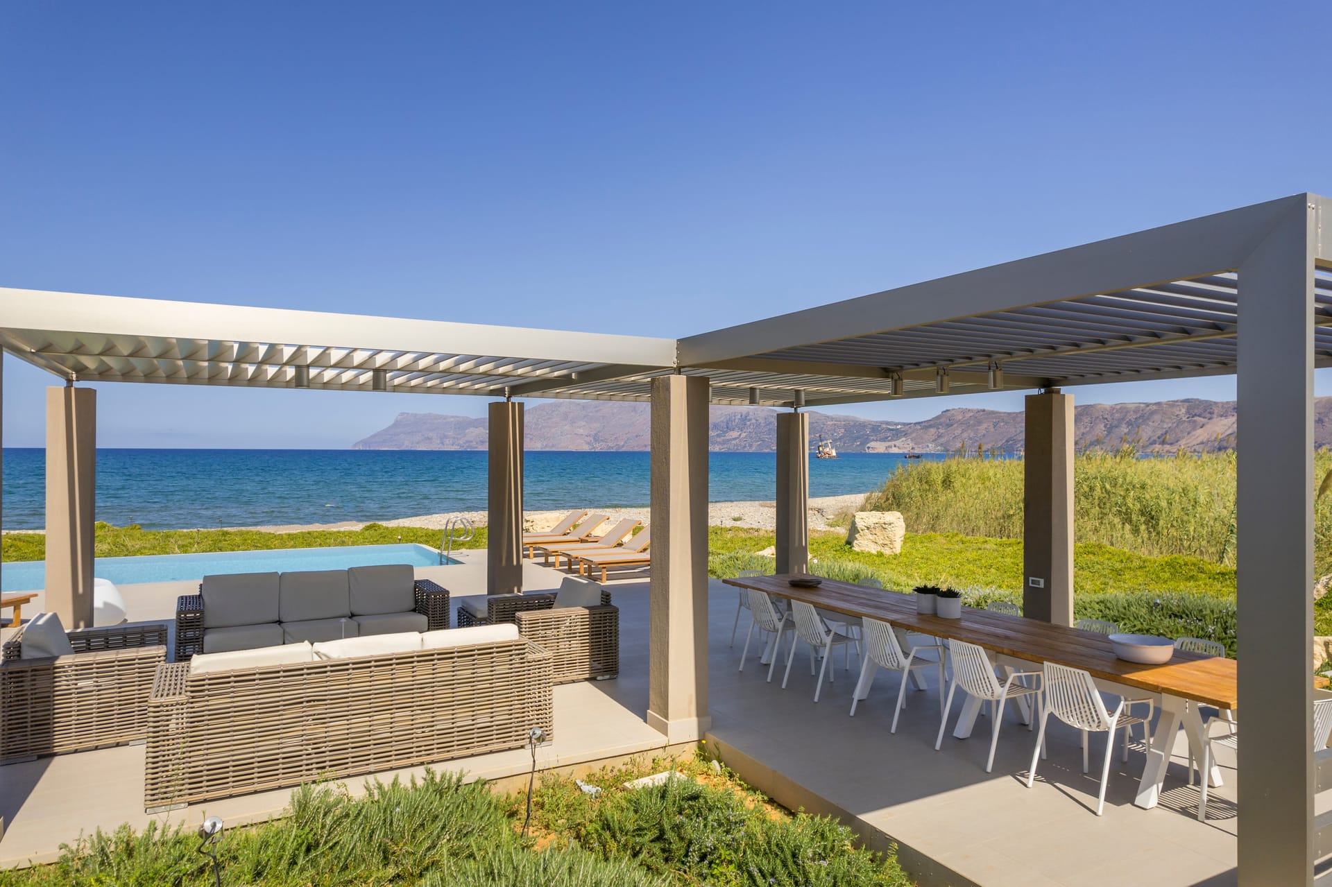 Located overlooking Kissamos Bay and just a few metres from the water’s edge, this is the largest of our two beachfront villas with a spacious kitchen and an innovative ‘hanging island’ dining table.