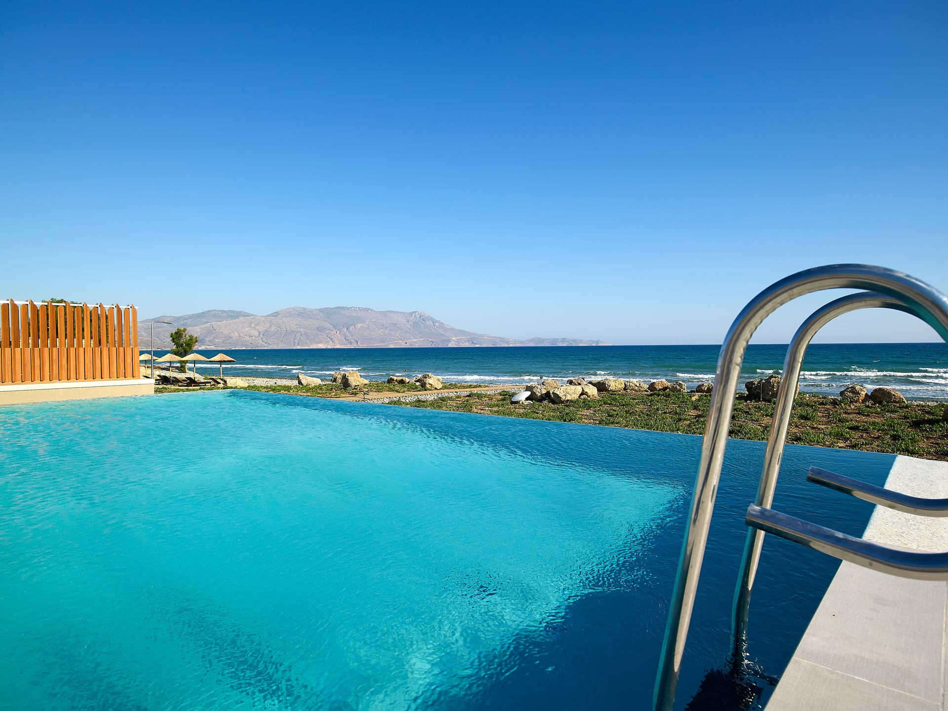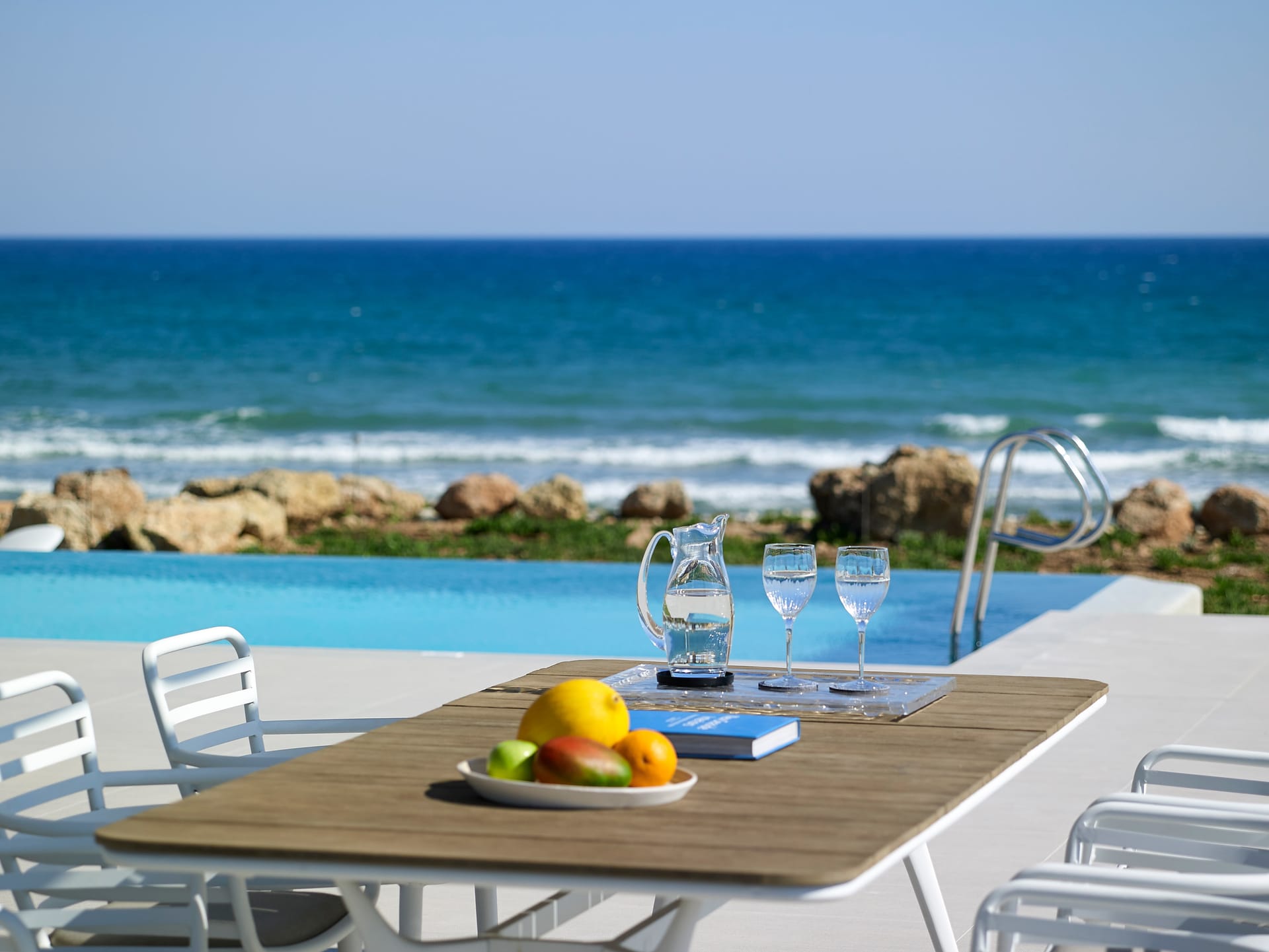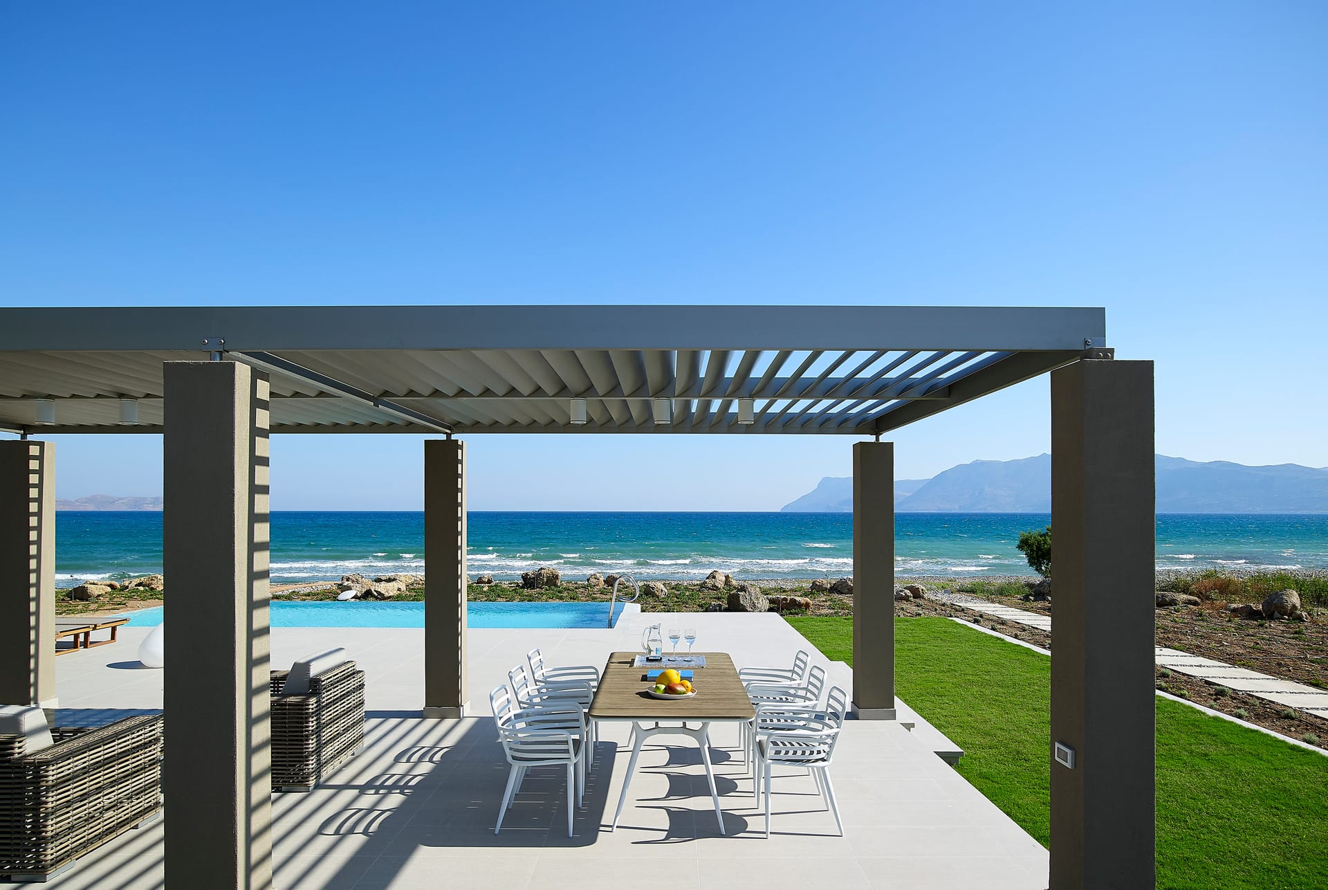 Located overlooking Kissamos Bay and just a few metres from the water’s edge, this is the largest of our two beachfront villas with a spacious kitchen and an innovative ‘hanging island’ dining table.