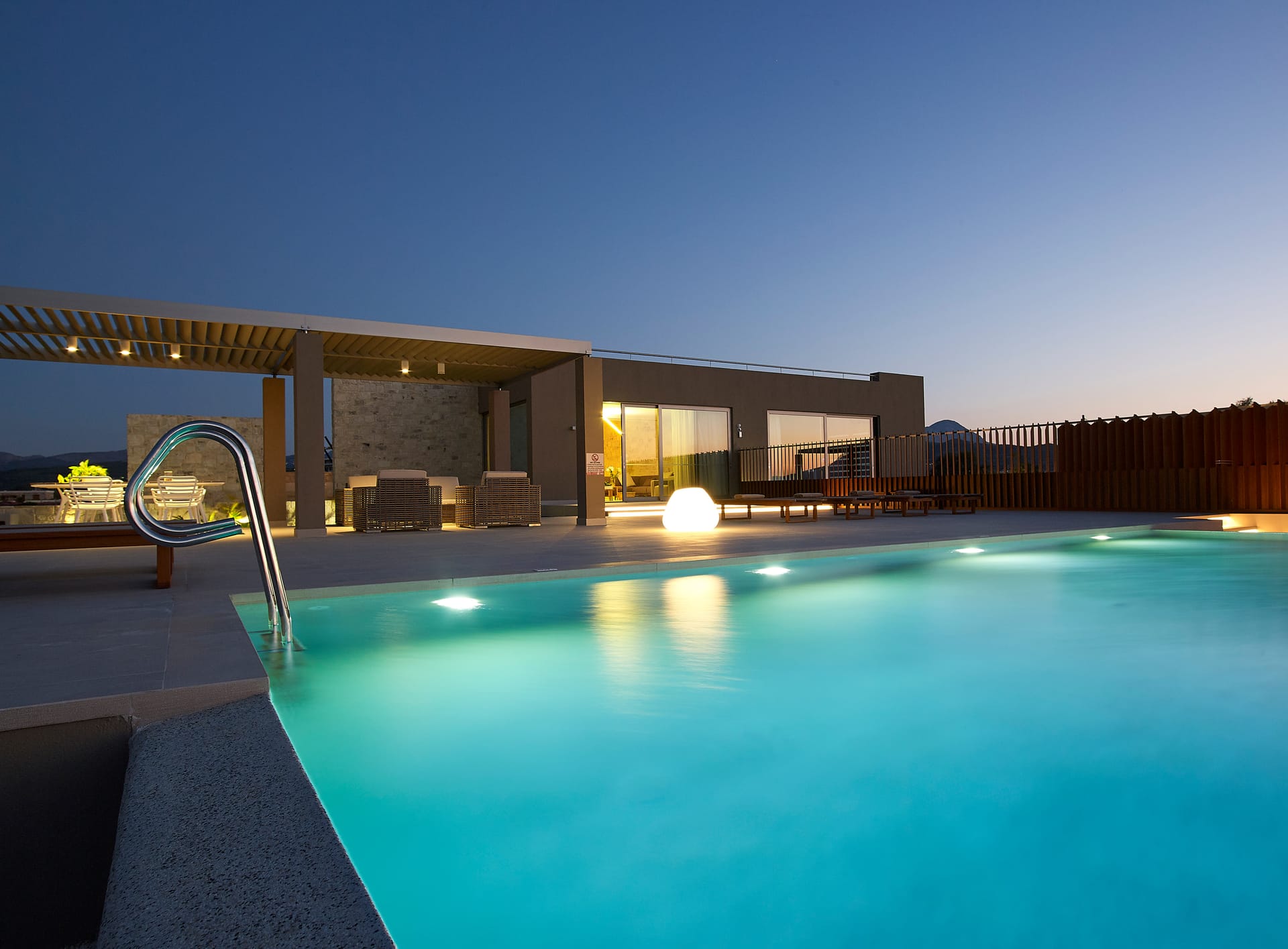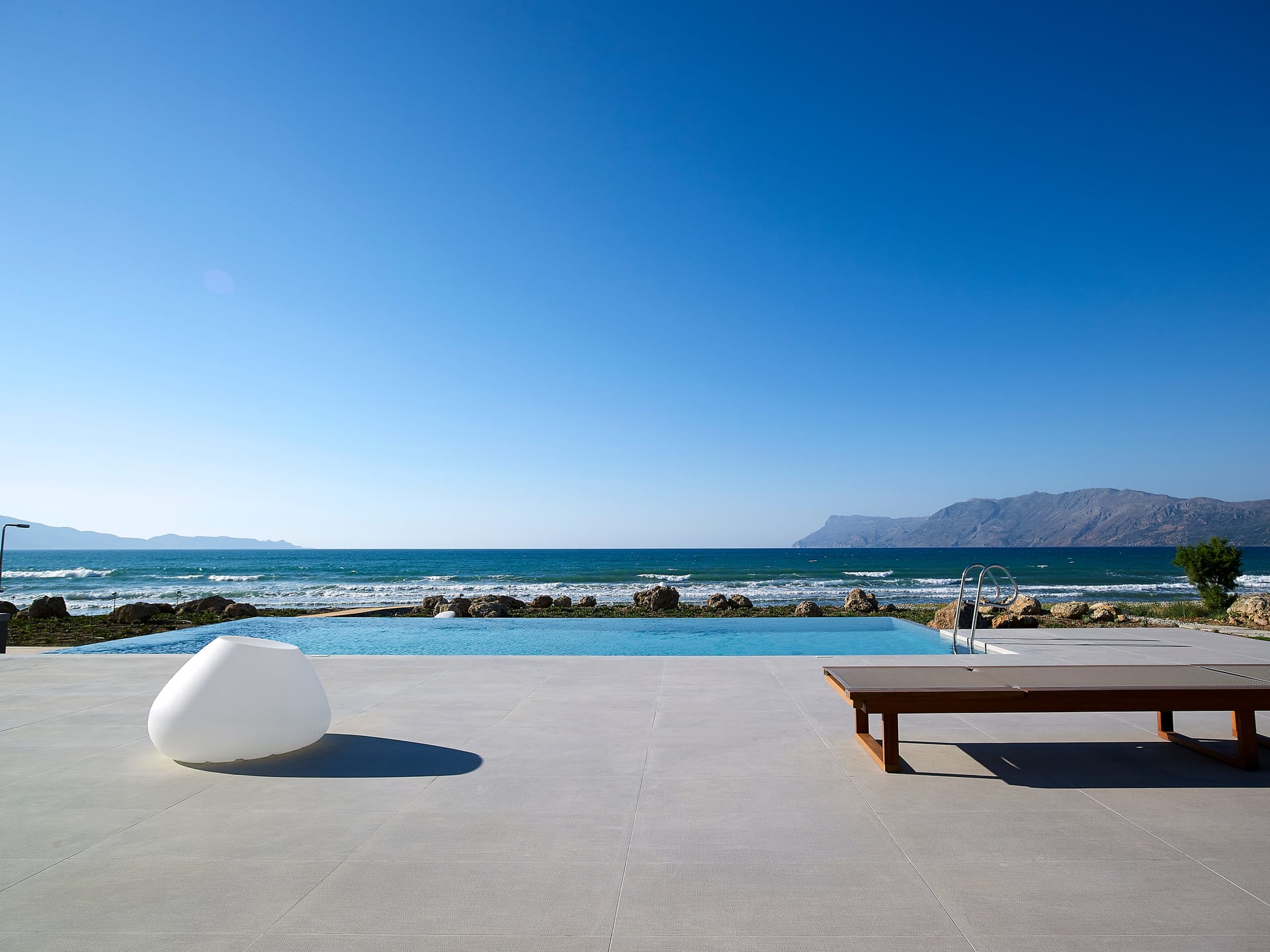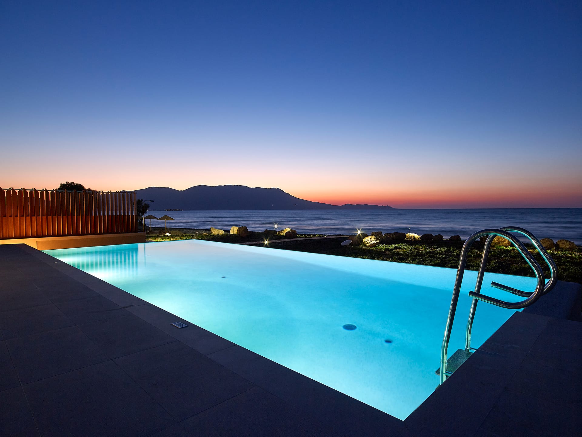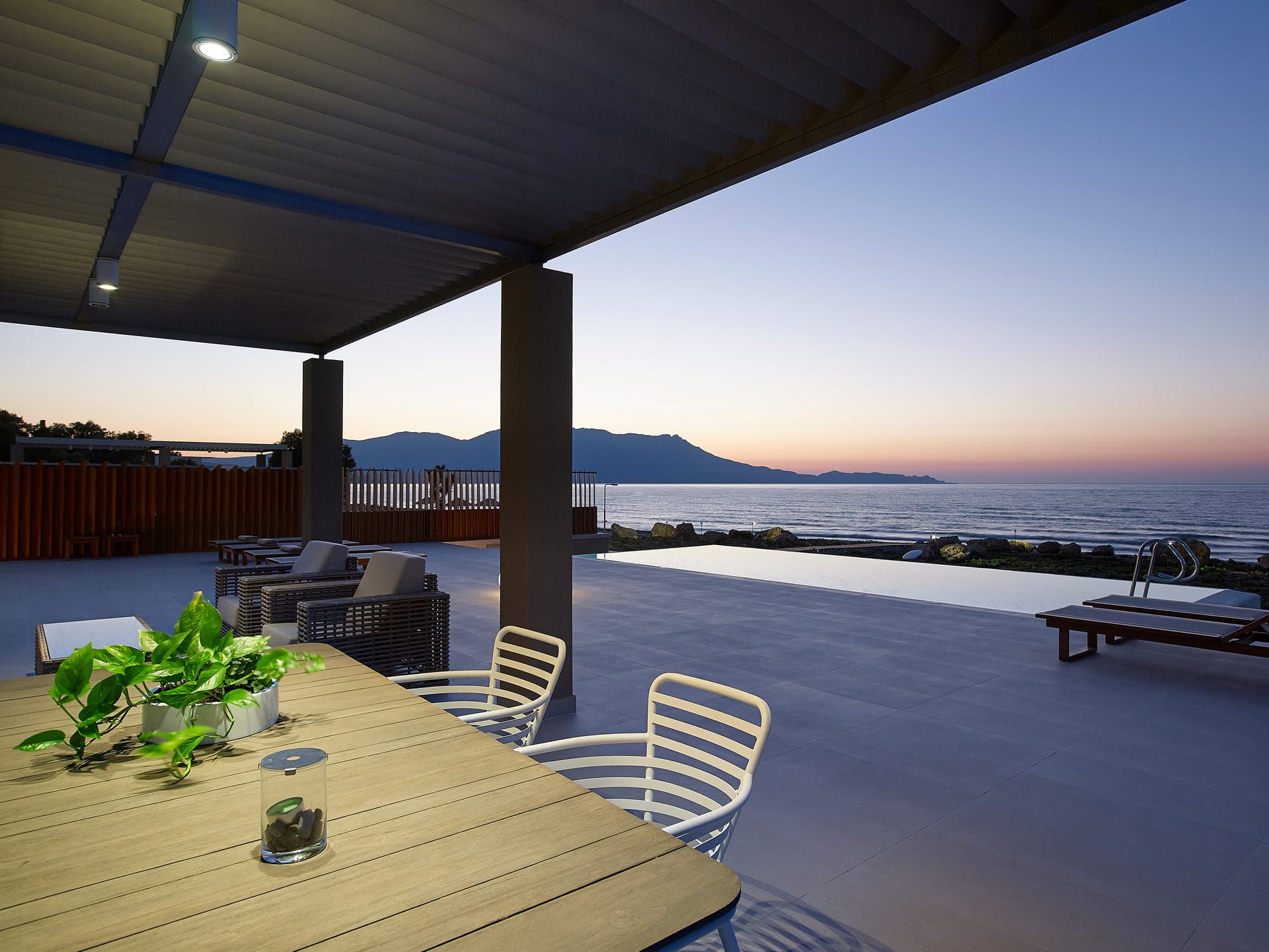 Cooled by a gentle sea breeze, you can be hypnotised by the lap of waves and the rocks in front of the villa, which are seductively lit at night to create a magical shoreline aura.